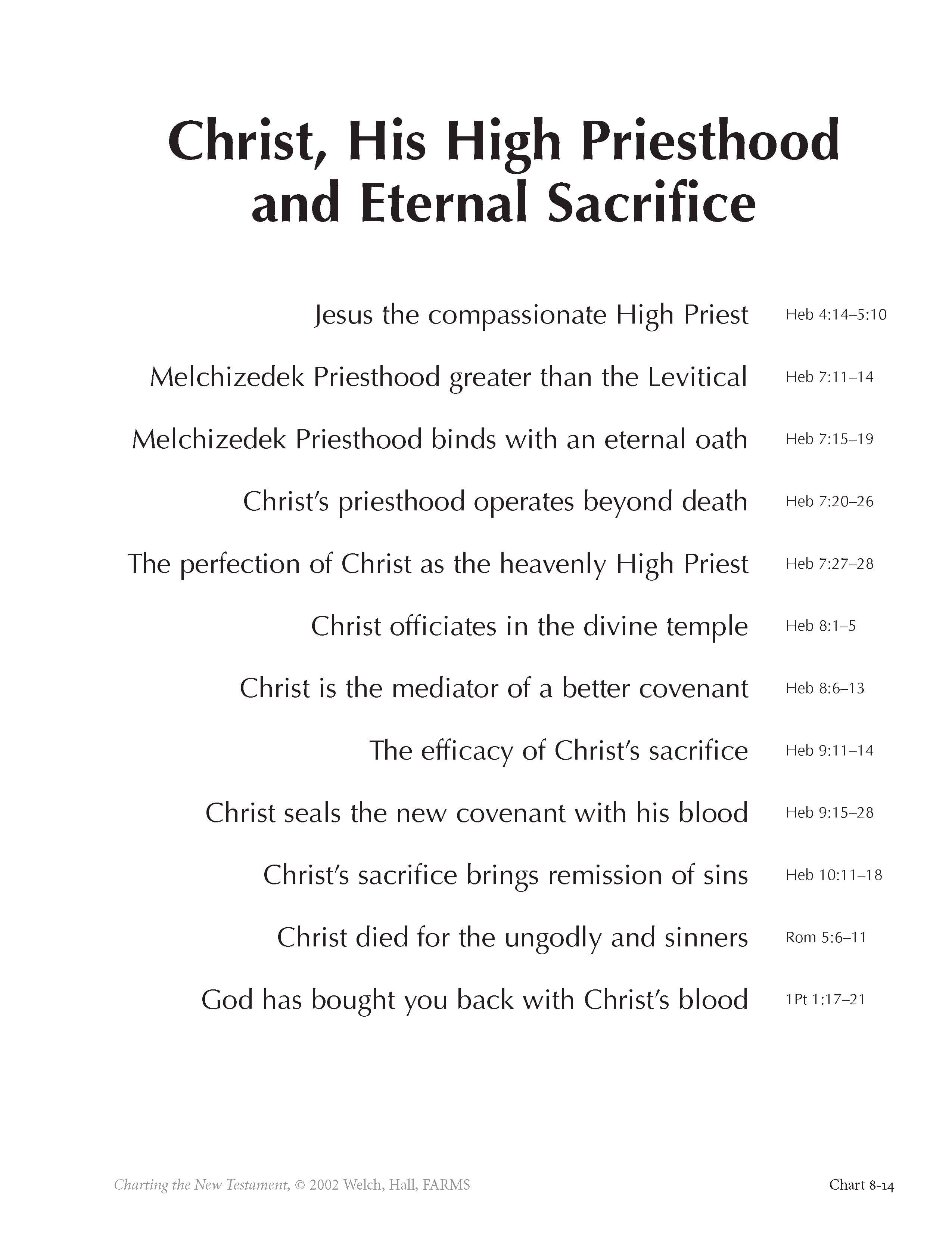 The Epistle to the Hebrews drives home the point that Jesus was the greatest High Priest who performed an eternal sacrifice of everlasting covenant with God. Nowhere in the New Testament is the atonement of Jesus Christ more comprehensively taught than in the heart of this important text. Many features of this atonement, which fulfills and transcends the atoning sacrifices previously performed by the Levitical priests under the Law of Moses, are clearly presented here, particularly its compassion, power, sworn certainty, immortal operation, perfection, authority, mediation, sacrificial efficacy, covenantal sealing, and remitting generosity. To the witness of Hebrews, the briefer testimonies of Romans and 1 Peter are also added.
