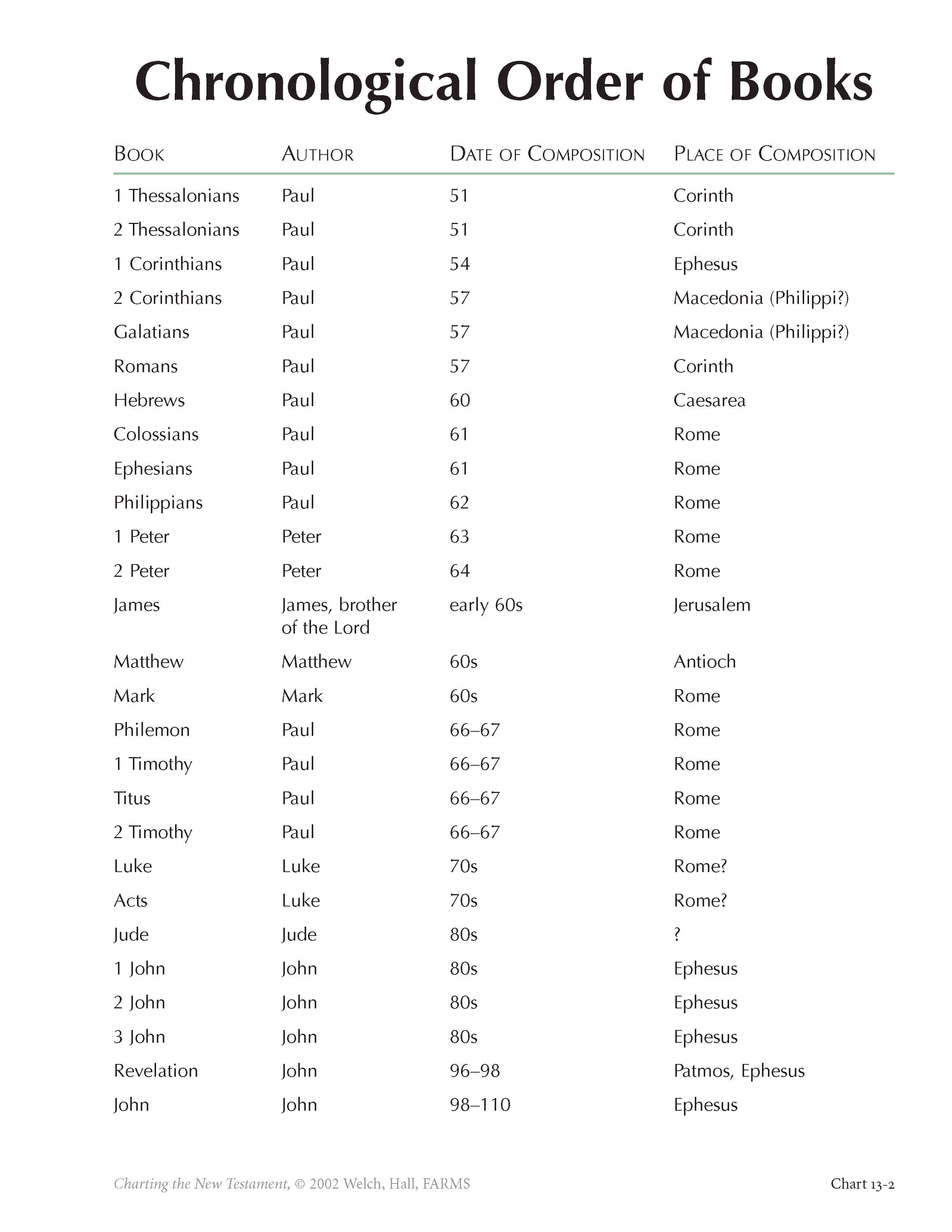 Chart 13-2 lists the books of the New Testament in the likely chronological order of their composition. The probable place of composition is also listed. In some cases, these dates and places are conjectural, but in a few cases the dates are quite certain. An awareness of the time and place of composition helps readers today to appreciate the situations and the audiences addressed in these compositions.