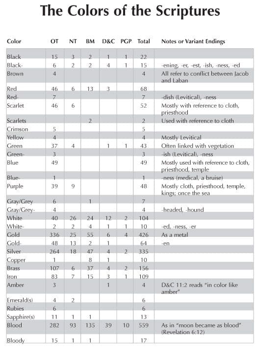 This chart compares the number of times a particular color is referred to in each of the standard works. References to particular colors are most similar between the Old Testament and the Book of Mormon, indirectly tying the Book of Mormon in yet another way to the physical world and culture of the Old Testament. The use of specific colors during ceremonies and rituals under the law of Moses could be one reason for this positive correlation.