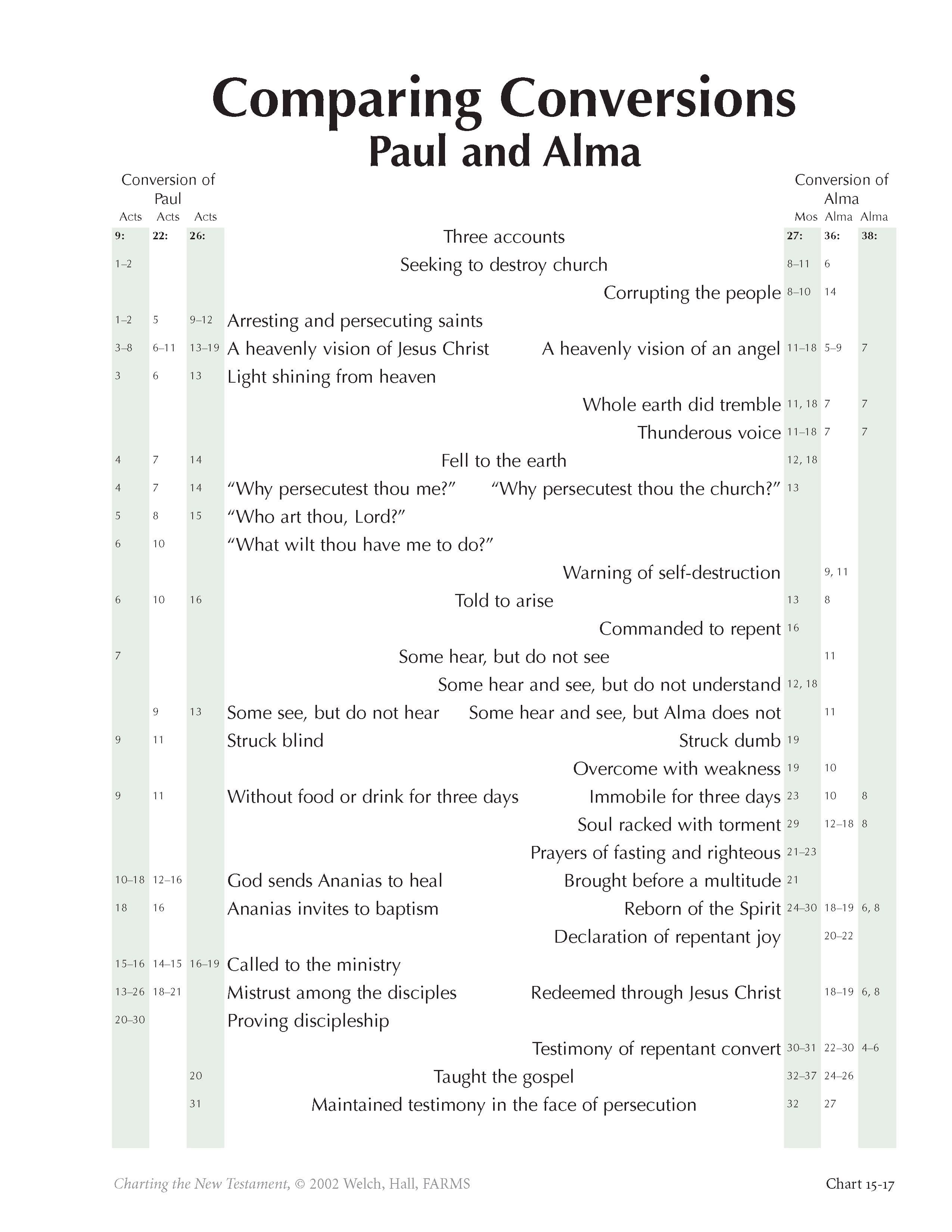 The conversions of Saul of Tarsus on the road to Damascus and of Alma the Younger in the land of Zarahemla are similar in certain fundamental respects, as one would expect since the source of their spiritual reversals was one and the same. Interestingly, in each case we have three accounts of their conversions: Paul’s conversion is reported in Acts 9, 22, and 26. Alma’s conversion is given in Mosiah 27, Alma 36, and 38. No two of these accounts are exactly the same. The columns on the far right and left sides of chart 15-17 show the verses of these six accounts in which each element either appears or is absent. Down the middle are found the elements shared by both Paul and Alma, and off center are words or experiences unique to either Paul or Alma. In sum, the personalized differences significantly offset and highlight the individual experiences in the two conversions.