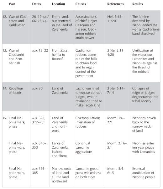 This three-page chart is a more detailed representation of the fifteen Nephite wars listed in chart 136. It tracks each major war's approximate dates and locations, as well as its causes and results. Though the wars are very different from each other, they share some interesting patterns. For example, several of the wars were caused when one group of people tried to separate from the main group. Apparently, the Nephites were restricted in their travel, and defection from the land was considered an act of treason and a cause for armed intervention. Another pattern is that opponents to the government chose to strike right after a new leader had taken office or when the government or the church was weakened by dissension. Amalickiah's wars, for instance, were initiated when dissenters banded together and desired a king, shortly after Alma left and Helaman was newly in office (see Alma 45:23–46:7). Studying the amazingly consistent complexity and sensible realism of these war accounts brings to light the real-life issues and dynamics behind the Nephite history told in the Book of Mormon.