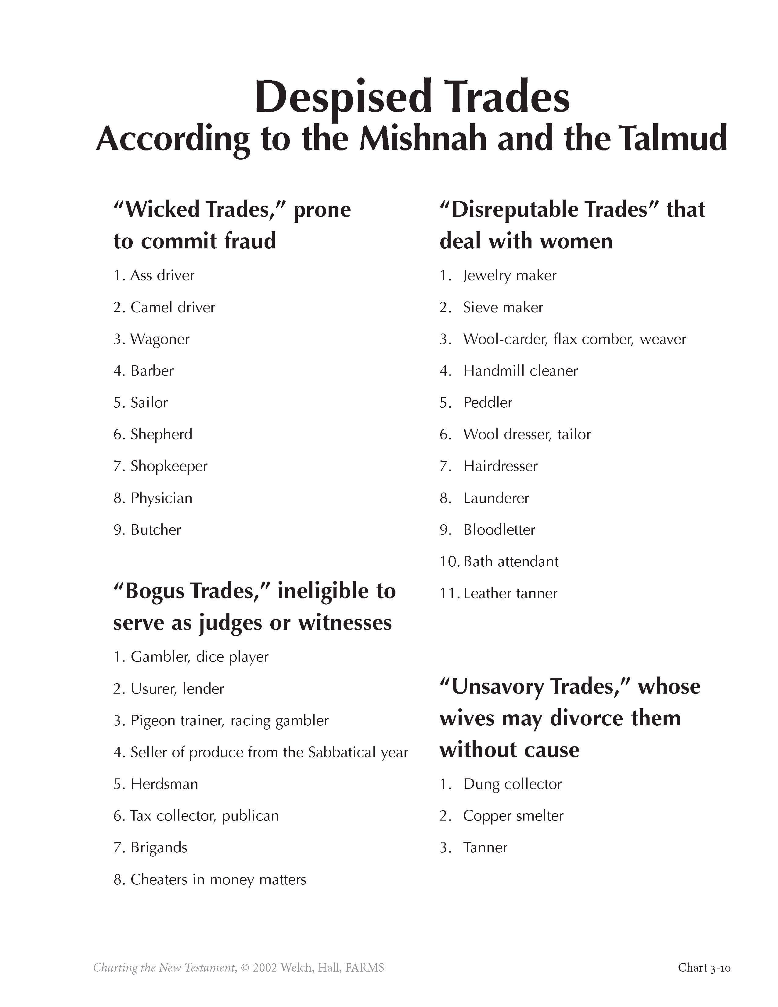 This social picture reminds readers that Jesus was very popular with the Jewish masses, dealing openly with the despised outcasts of his society. Chart 3-10 presents a glimpse into the class structure that pervaded the world of Judea shortly after the New Testament era, especially from the viewpoint of the Pharisees, according to the Mishnah and Talmud. Four Jewish texts list occupations that were despised; they were considered impure, largely because they came in contact with blood or women, or were prone toward fraud or deception. Men in these trades were legally and religiously disadvantaged. Notably on these lists of despised trades, Matthew was a tax collector; Luke was a physician; and Jesus called himself a shepherd, often associated with women, and was accused of being a brigand or robber.