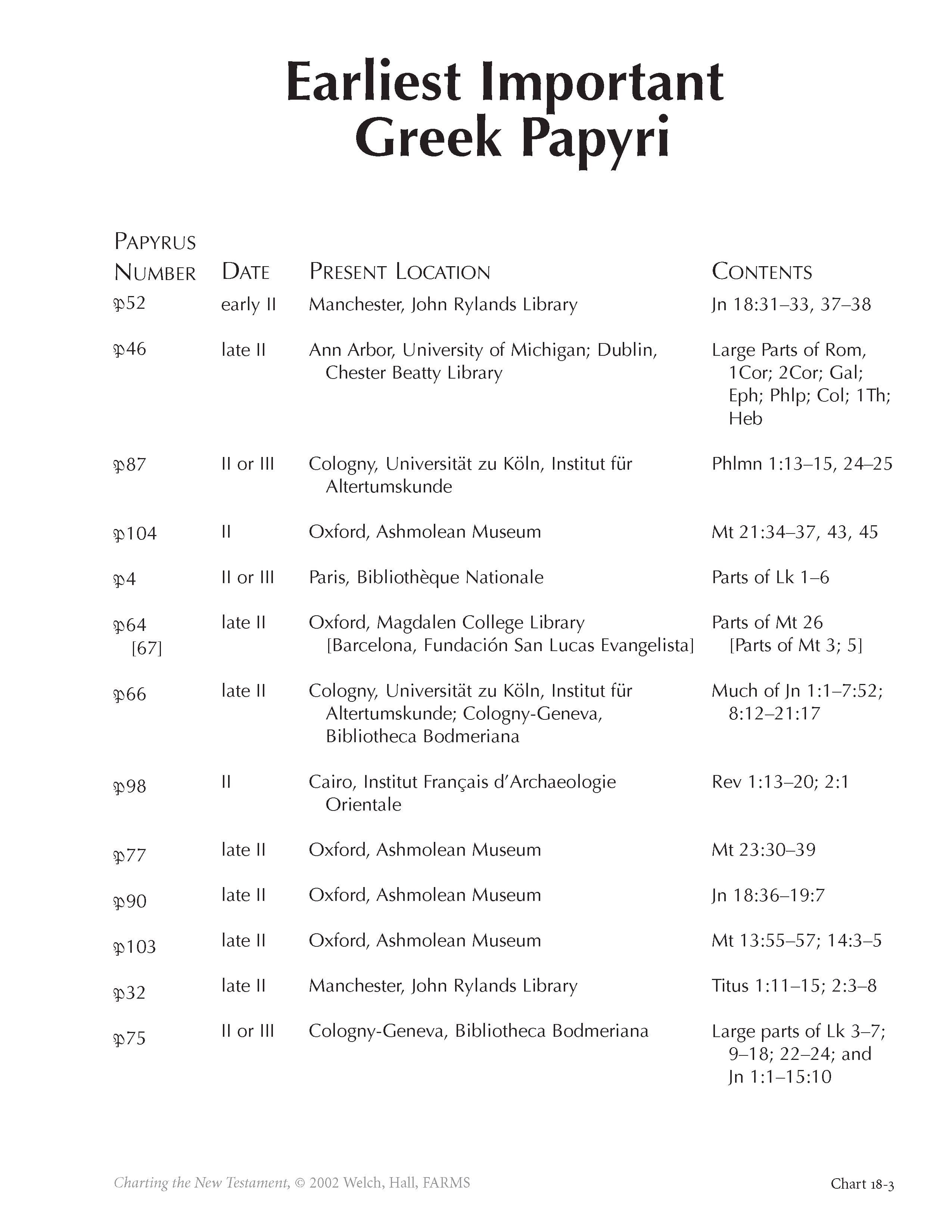 All the books of the New Testament were originally written in Greek. Other sources, written and oral, certainly stood behind these final literary products, but in the end the good news of the ministry of Jesus Christ and his apostles was disseminated to the world in the common language of the day throughout the Roman Empire, namely Greek. Over 100 fragments of individual gospels or letters have been found by archaeologists or archivists that date before A.D. 325. Chart 18-3 lists the most famous of these early texts, which were written on papyrus. Some contain only a few words or verses, but a few are quite extensive and extremely precious.