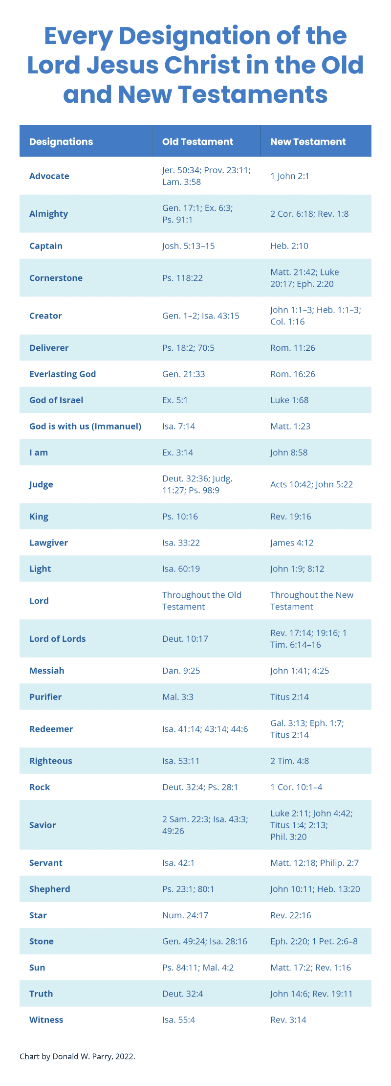 Proper understanding of these designations demonstrates that Jesus Christ is the God of the Old Testament; furthermore, knowledge of equivalent designations adds great understanding of the Lord Jesus Christ and His divine and formidable work with individuals, peoples, and nations in both the Old and New Testaments. Beyond the examples in the chart, many others could also be set forth.