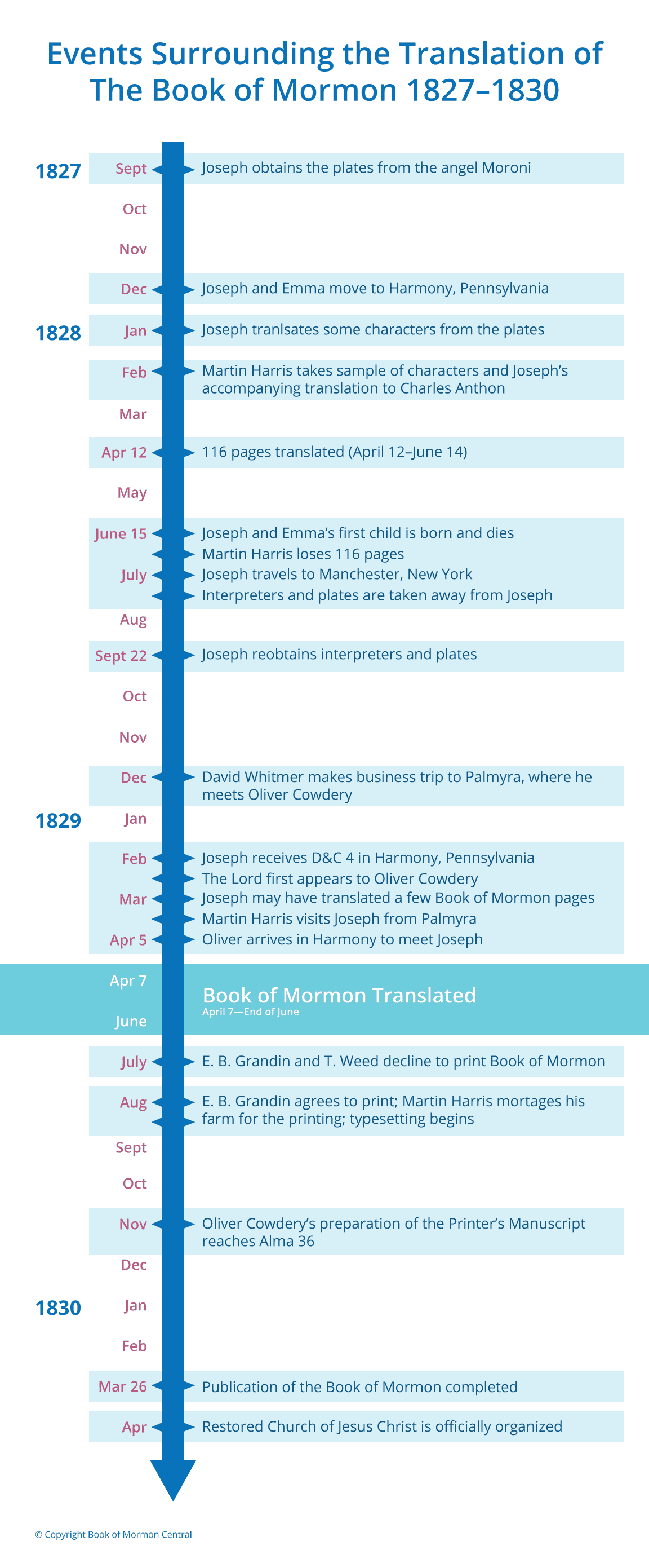 This chart highlights important events that were instrumental in helping bring forth the Book of Mormon. It also depicts some of the sacrifices that were required to accomplish this monumental task. Knowing the order and timing of these events can help readers better appreciate the miraculously rapid pace in which the Book of Mormon was translated and published.