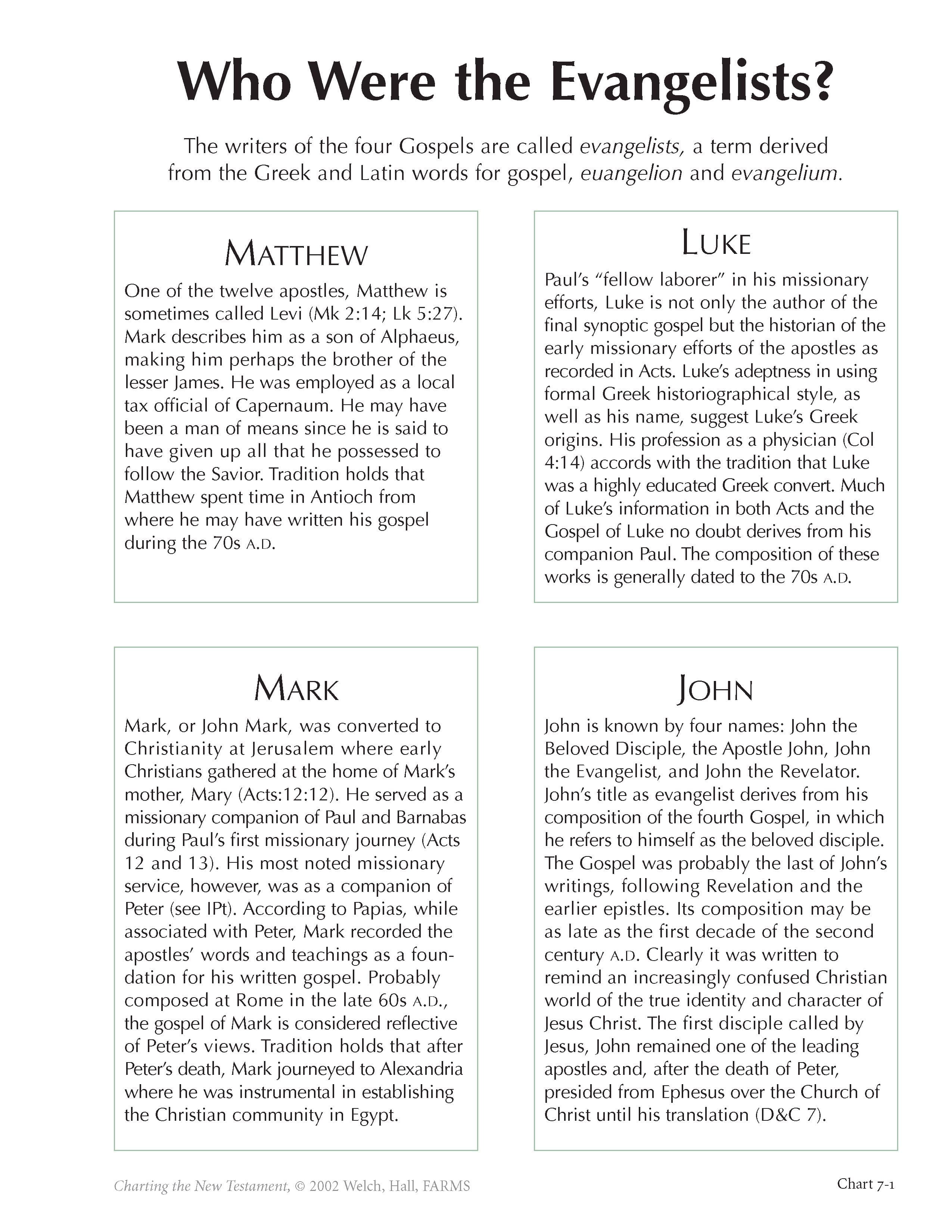 Each Gospel delivers the message of Jesus Christ through its own distinctive style and approach. Significantly, each Gospel traces the origins of Jesus back to a different point. Read from the bottom up, chart 7-2 shows that Matthew takes the genealogy of Jesus only back to David and Abraham, reflecting Matthew’s Jewish interests. Luke takes the genealogy back to Adam, reflecting his broader gentile interest in all humankind. Mark gives Jesus no mortal genealogy, for his declared purpose at the outset of his gospel is to emphasize Jesus as the Son of God, not of man. John begins even farther back, where “in the beginning” Jesus was with God and was a God. These points of reference reflect and influence in many ways the different purposes, styles, vocabularies, contents, and characteristics of each of the four Gospels.