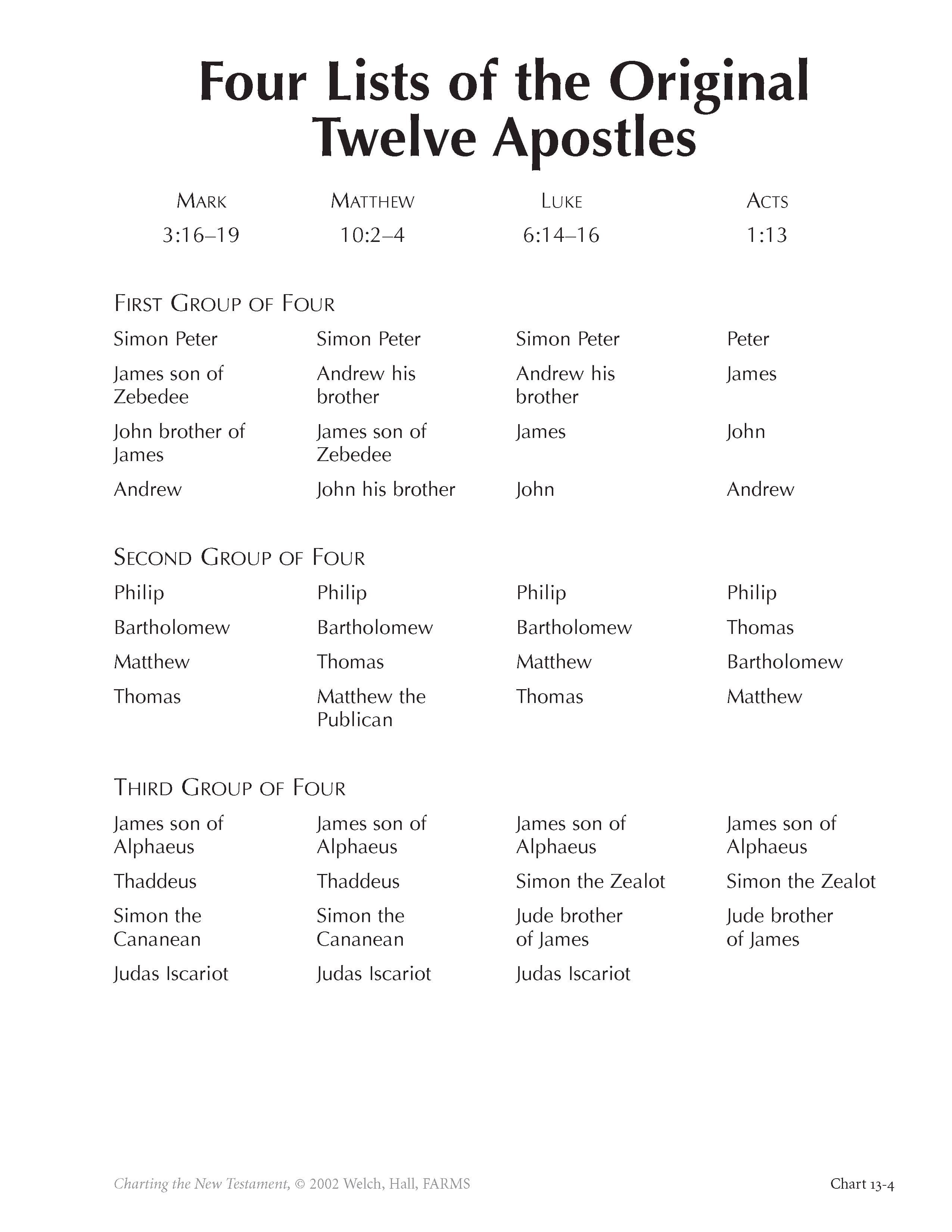 The Twelve Apostles are listed not only in the three synoptic gospels, but also in Acts. While the lists vary in order, they include the same individuals. The only discrepancy is that Mark and Matthew identify Jude as Thaddeus. Scholars suggest this was done to avoid confusion with the infamous Judas Iscariot. Elder James Talmage (Jesus the Christ, 224–25) agrees that Jude and Thaddeus are one and the same. The listings appear in three groupings, always with the same four apostles in each group. The first group always includes the inner circle of Peter, James, and John, with Peter listed first, no doubt as an indication of his presidency within the quorum. It is unclear why the order of names within their groupings is different from one list to another.