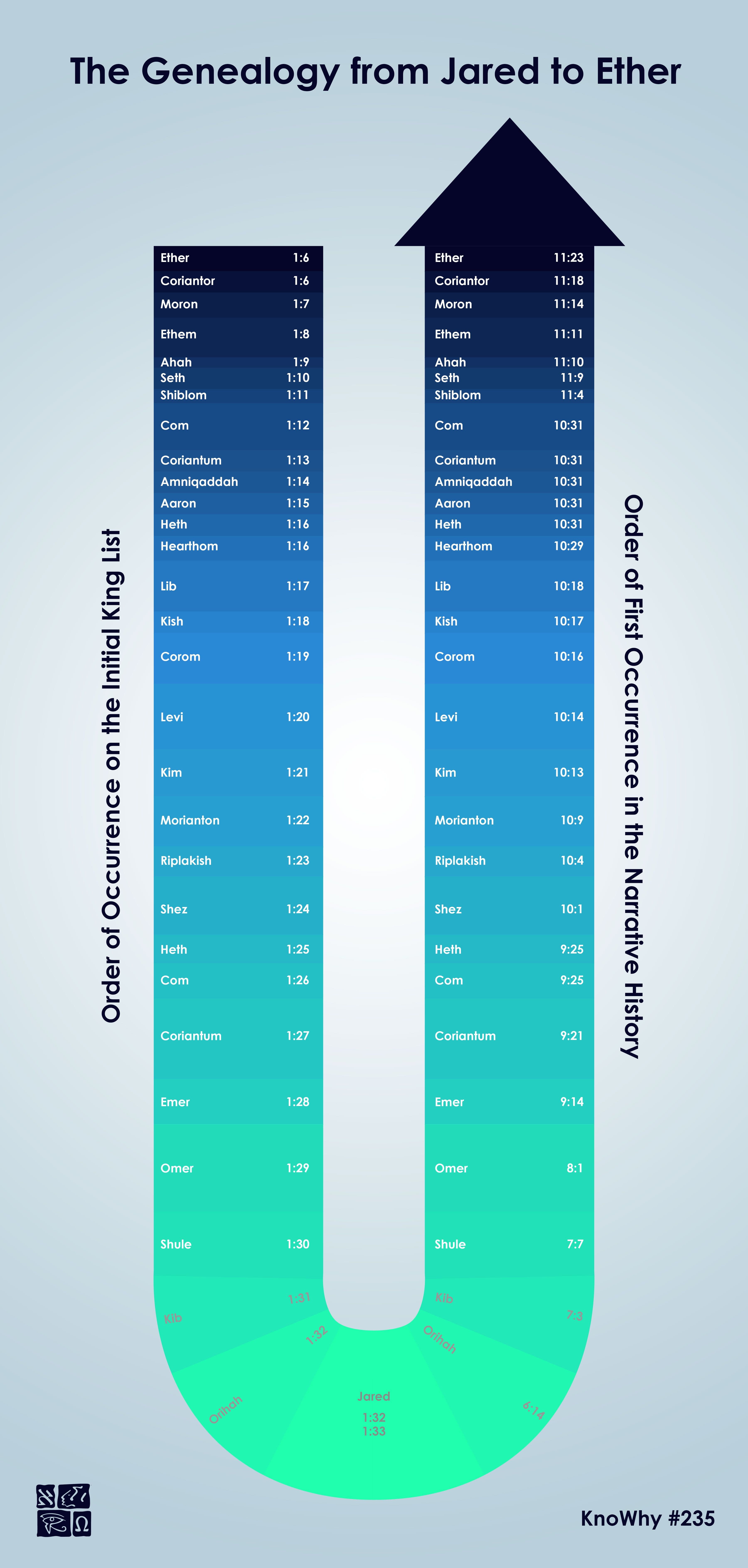 The Book of Ether begins with a genealogy that descends in reverse chronological order from Ether to Jared. Such a long genealogy is unusual for the Book of Mormon, but it was likely written this way because it serves as a template for the rest of the book of Ether. Throughout the book, each king is discussed in exact reverse order to the way they appear in the list, never missing a name or getting them out of order. Seeing how the author structured the Book of Ether allows us to understand him, and the book, better.