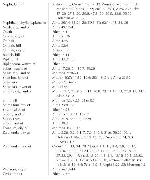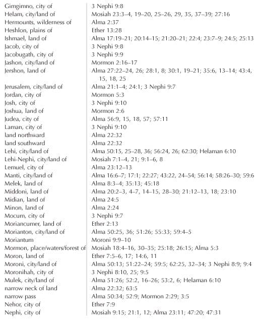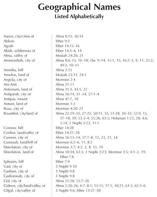 The first column of this three-page chart lists geographical names or features found in the Book of Mormon, and corresponding scriptural references appear in the second column. This list may be helpful for a student wishing to search the Book of Mormon for the geographical information found within it.