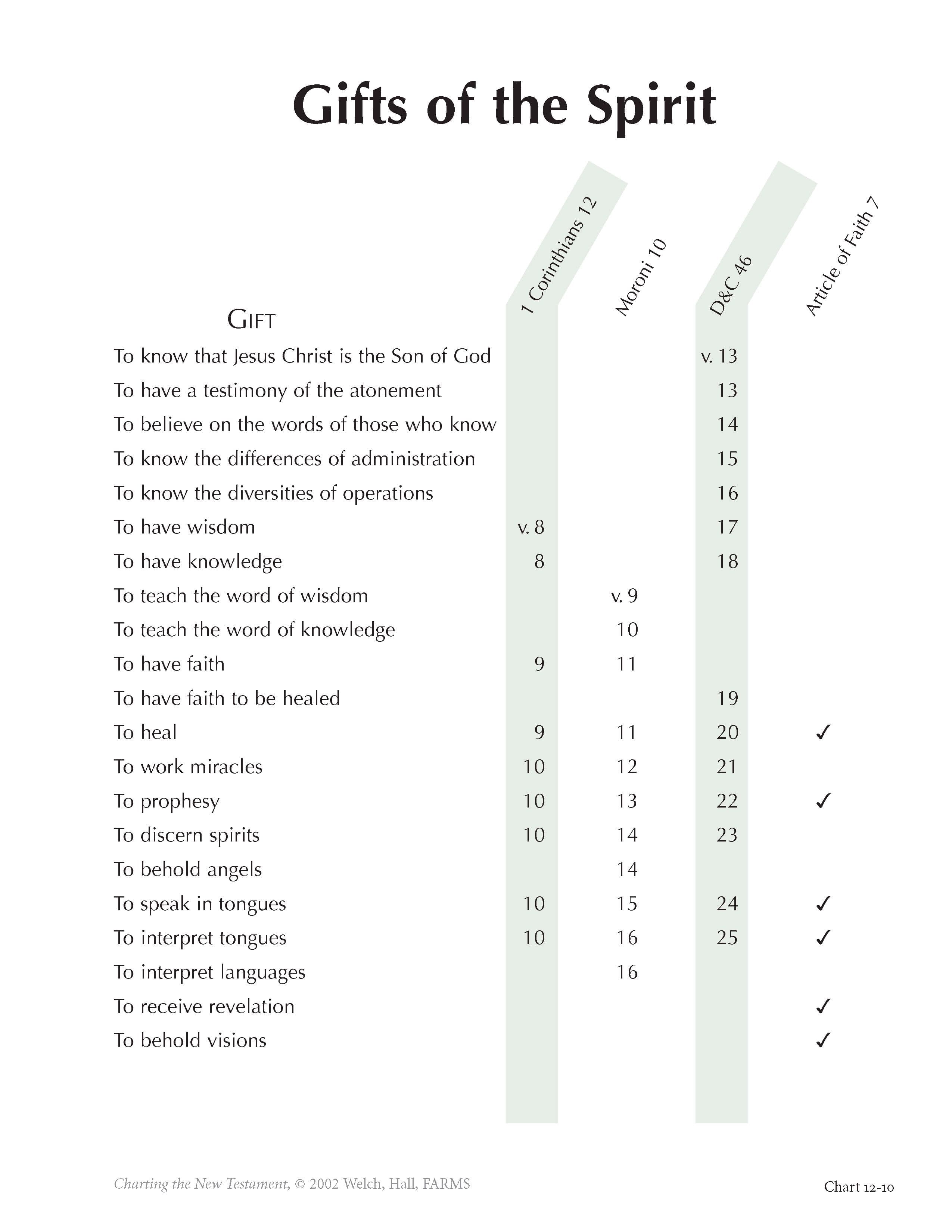 The main purpose of priesthood in the Church of Jesus Christ is to lead the faithful in such a way that they can feel and receive the gifts of the Spirit, the greatest of which is the gift of eternal life. The gifts of the spirit are rich and manifold. Chart 12-10 combines into a single profile the array of spiritual gifts that are mentioned in four scriptural lists: in 1 Corinthians 12, Moroni 10, Doctrine and Covenants 46, and the seventh Article of Faith. No two of these lists are the same, just as no two individuals are the same. To one is given one gift; to others are given other gifts.