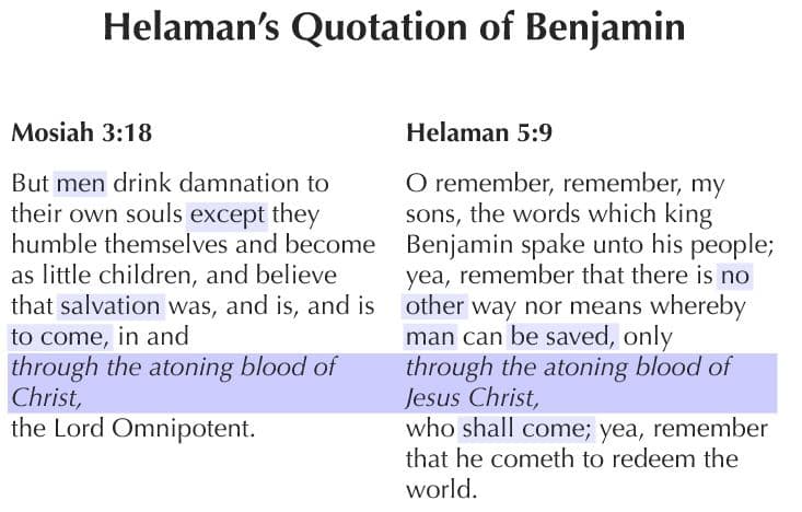 Like Alma, Helaman was familiar with the prophecies of his ancestors. As this chart demonstrates, Helaman quoted and paraphrased Benjamin, whose words he considered highly important, when he encouraged his sons to remember that salvation comes only through the atonement of Jesus Christ.