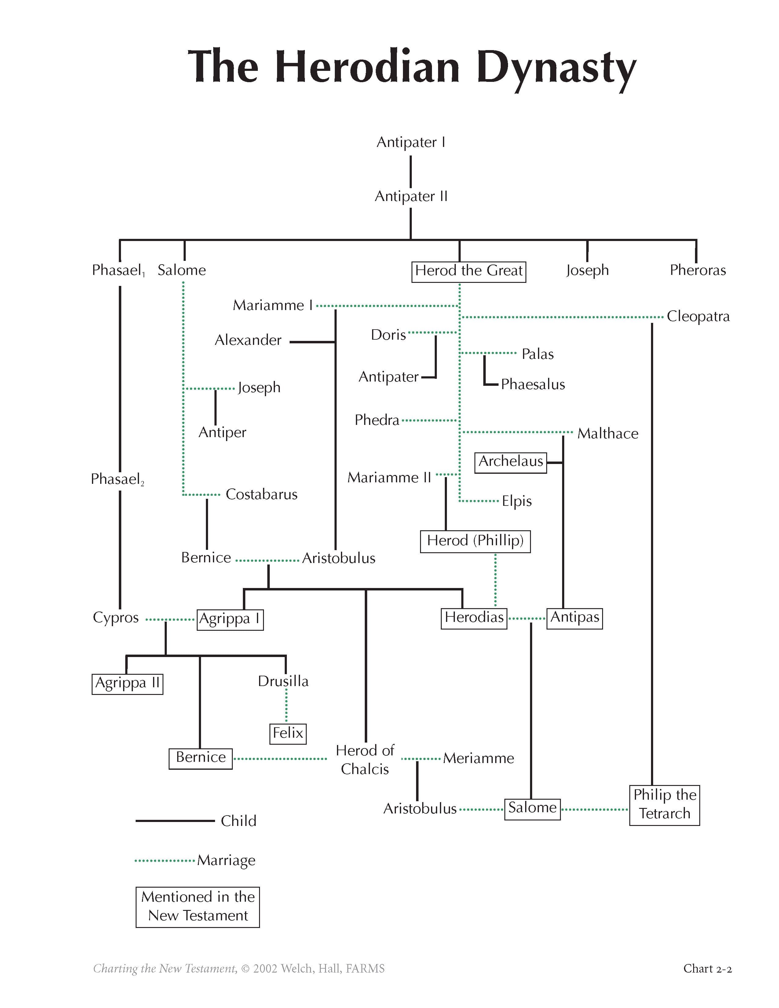 The complicated family tree of Herod the Great, beginning with his grandfather and ending with several people mentioned later in the New Testament, is shown on chart 2-2. Eight of his wives are shown. The family was dysfunctional, tumultuous, and sometimes violent. It was said by some that it was better to be a pig than a son of Herod.