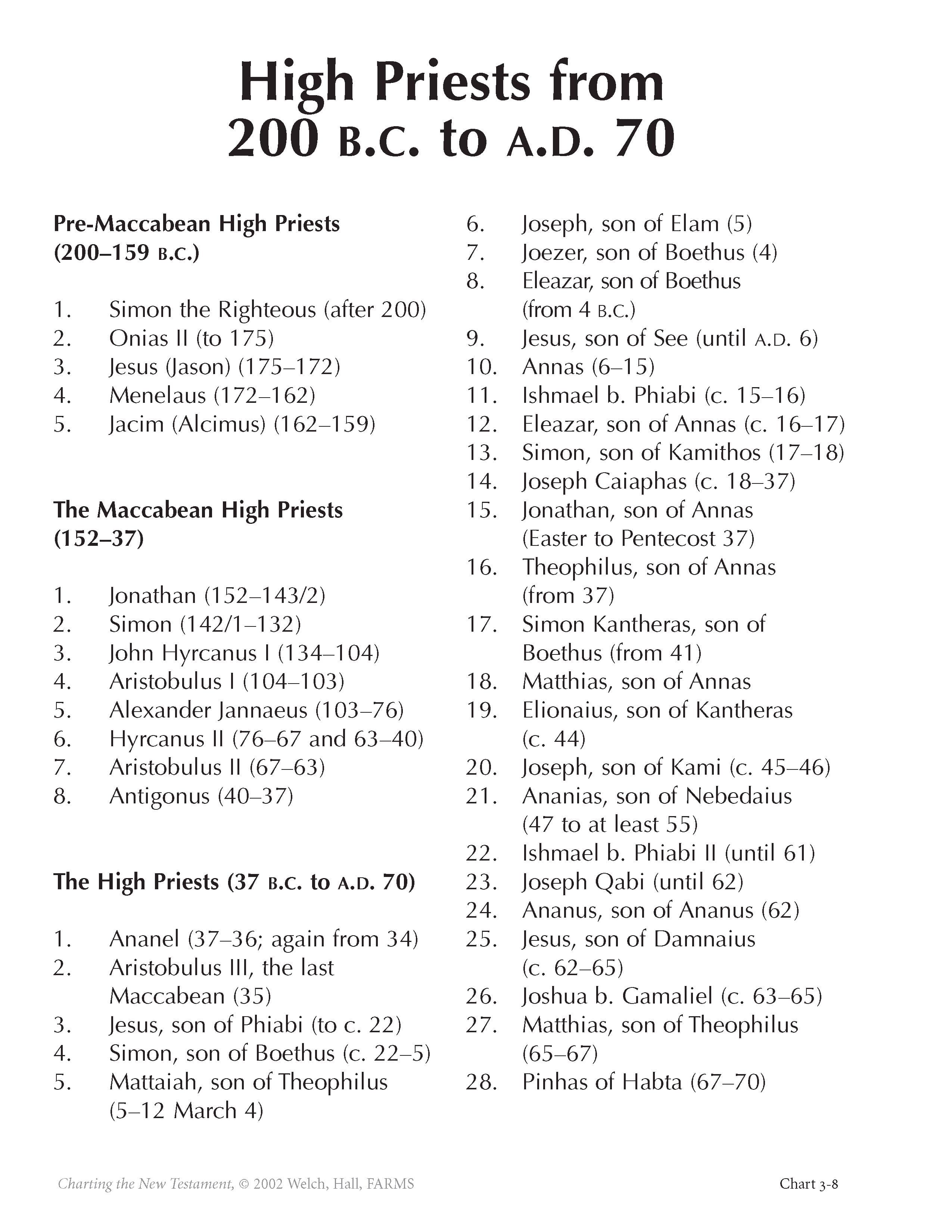 Chart 3-8 lists the High Priests down to the destruction of the temple in A.D. 70. Caiaphas, who was the High Priest at the time of the trial of Jesus, reigned for almost twenty years, an exceptionally long term in office.