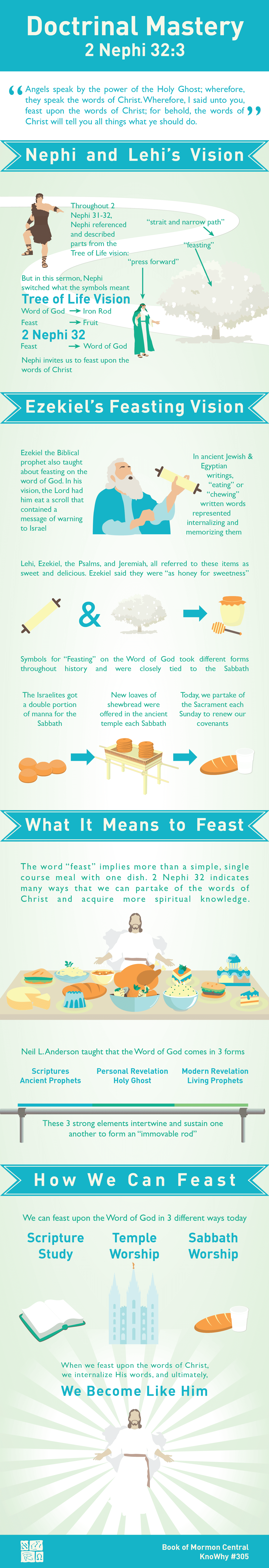 Nephi made several allusions to his father's vision of the tree of life as he taught people to "feast" on the word of Christ. Contemporary prophets like Ezekiel likewise "ate" the word of the Lord as a symbolic gesture, and there appear to temple and Sabbath day connotations in the symbolism. All of this provides a rich feast of insights on what it means to "feast upon the words of Christ."