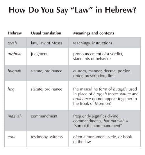 The Hebrew language uses at least six different words that are translated into English as the word law. Torah refers to the law, especially the law of Moses, while mishpat signifies judgment or standards based on the law. Huqqah and hoq are similar in meaning, suggesting not only formal ordinances but also general codes of behavior. Mitzvah denotes divine commandments in general, and edut, while a more ambiguous term, often signifies a written law. For example, King David counseled Solomon to keep God's "statutes [huqqot], and his commandments [mitzvot], and his judgments [mishpatim], and his testimonies [edut], as it is written in the law [torah] of Moses" (1 Kings 2:3). Similarly, Nephi states that his people observed "the judgments, and the statutes, and the commandments of the Lord in all things, according to the law of Moses" (2 Nephi 5:10). The striking similarities between these texts reveal that the Hebrew-speaking Nephites and the ancient Israelites conceived law in much the same way.