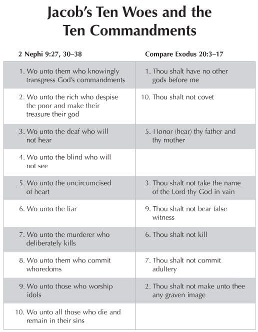 In 2 Nephi 9, Jacob pronounces a "wo" or curse upon the people of Nephi who do not keep the commandments. This chart shows that the specific sins he denounces are similar to several of the sins committed when the Ten Commandments are broken. The two lists are not identical, but it is evident that they are related at several levels. Both give ten warnings, woes, commands, or prohibitions. The fourth commandment (addressing the Sabbath day) and the eighth commandment (prohibiting stealing) are not on Jacob's list, possibly because they were not a problem for Jacob's isolated audience to keep. (Note that each item in the chart is numbered according to its order in the scriptural passage it appears in.)