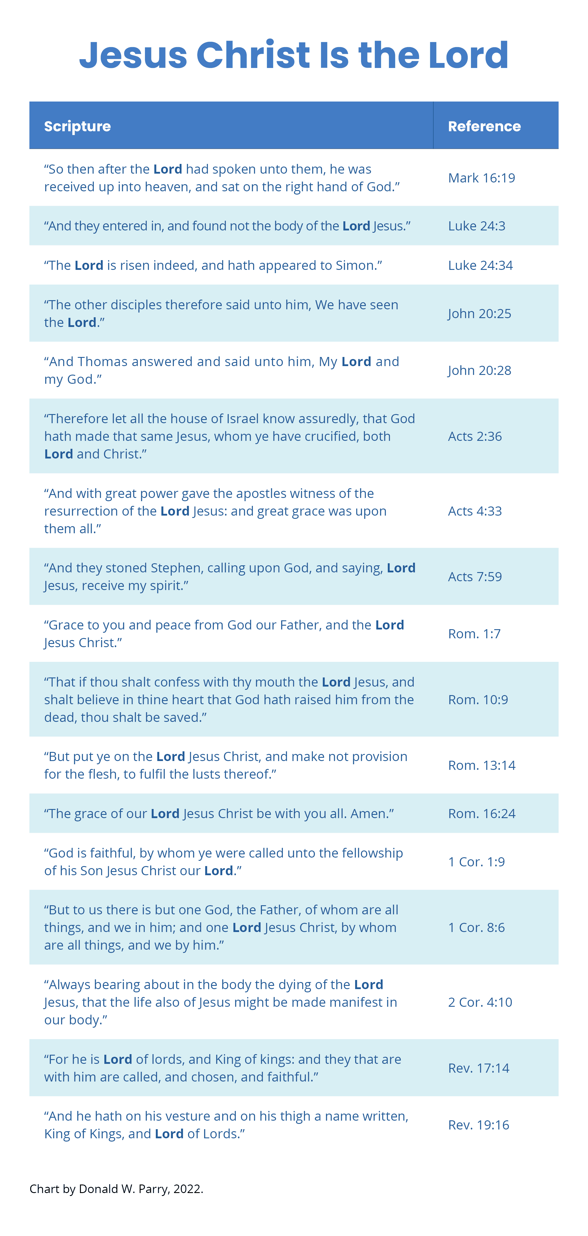 Twice John the Revelator testified that Jesus Christ is the “Lord of lords” (Rev. 17:14; 19:16), and Paul wrote of three significant doctrines—Resurrection, Atonement, and eternal life—regarding Jesus Christ the Lord: (1) “For to this end Christ both died, and rose, and revived, that he might be Lord both of the dead and living” (Rom. 14:9); (2) “And not only so, but we also joy in God through our Lord Jesus Christ, by whom we have now received the atonement” (Rom. 5:11); and (3) “That as sin hath reigned unto death, even so might grace reign through righteousness unto eternal life by Jesus Christ our Lord” (Rom. 5:21).