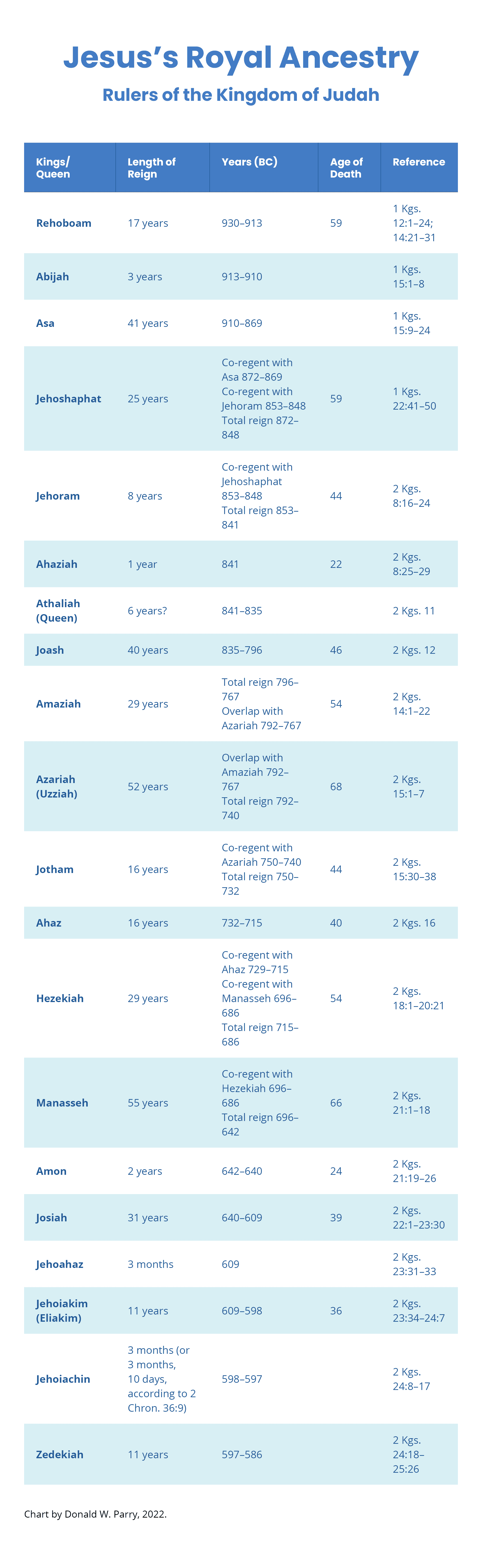 Matthew’s genealogy (Matt 1:1–16) names several of the rulers of the kingdom of Judah—Rehoboam, Abijah, Asa, Jehoshaphat, Jehoram, Ahaziah, Jotham, Ahaz, Hezekiah, Manasseh, Amon, and Josiah—that are part of Jesus Christ’s ancestry. Matthew’s genealogy also refers to King David and his son Solomon (Matt. 1:6–7). All of these rulers played prominent roles in world history, and all were Jesus’s progenitors.