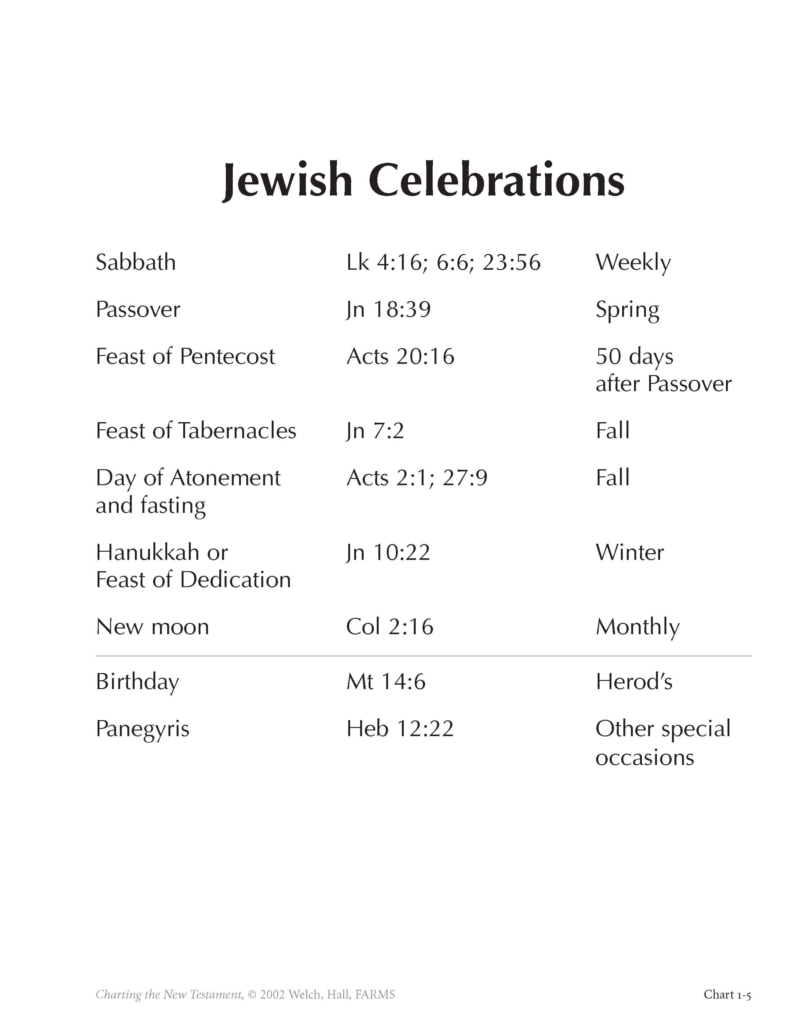 As chart 1-5 shows, many of these Jewish holy days are mentioned in the New Testament. Jesus went to Jerusalem to observe Passover, Tabernacles, and other sacred festivals. Early Christians gathered for the feast of Pentecost, and other days in the life cycle of the people of the day play a role in the texts of the New Testament. The birthday of Herod Antipas is mentioned, probably reflecting Greek or Roman influence, for most Jewish people did not celebrate birthdays. For the pious Jew, life began with circumcision, not birth, and perhaps for this reason, birthday parties do not figure in the New Testament and the birth of Jesus narrative culminates with the account of his circumcision (Lk 2:21).