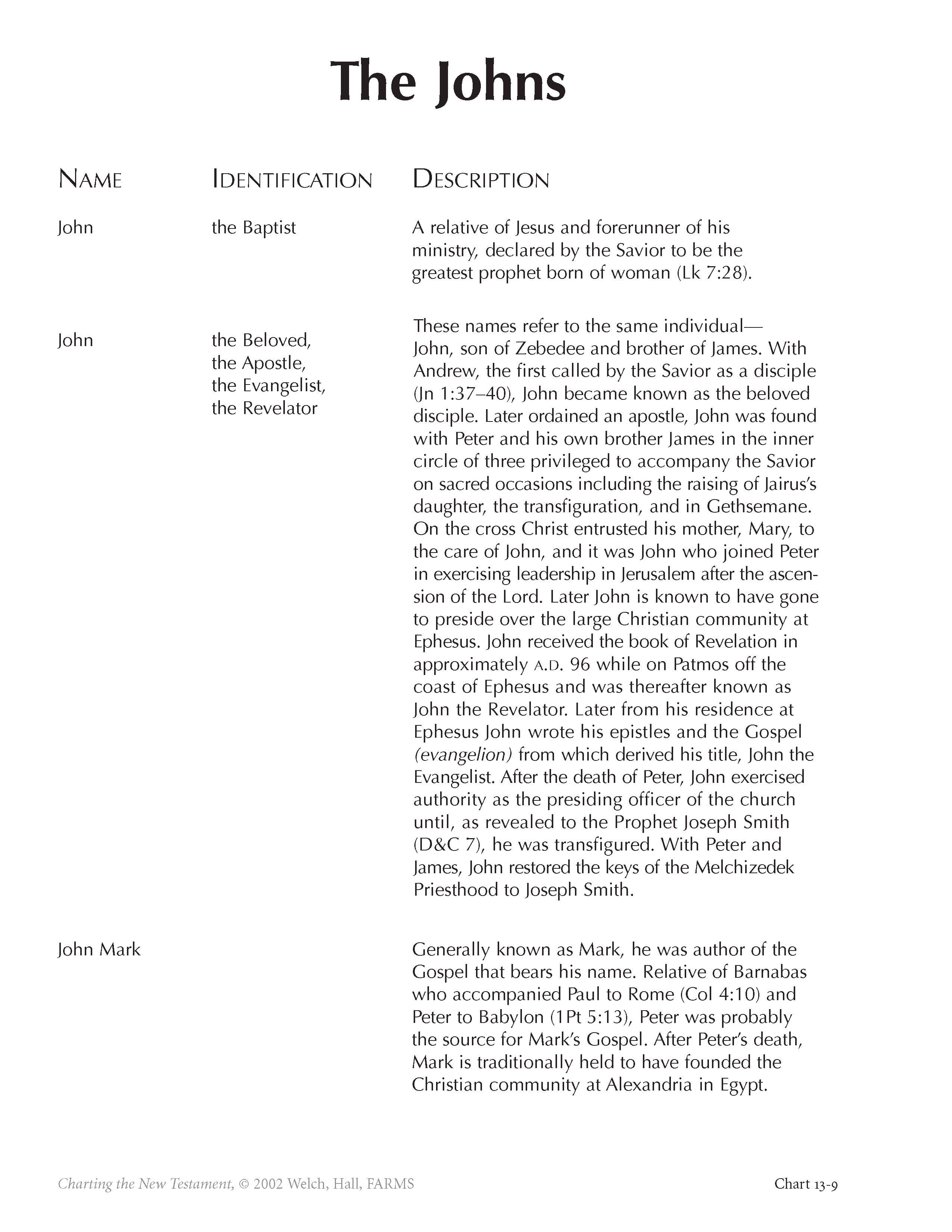The following three charts differentiate, as much as possible, between the Marys mentioned in the New Testament, as well as the Jameses and the Johns. Among these people are some of the most important figures in early Christianity.