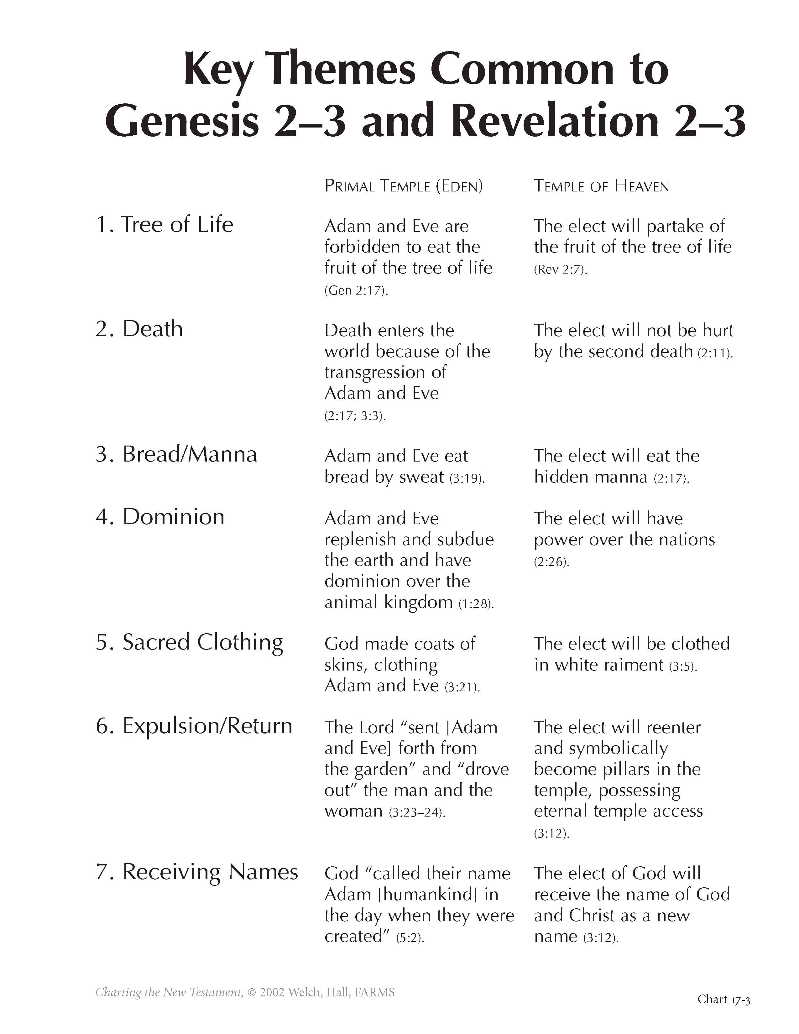 The Garden of Eden was a holy, sacred place. In many ways, it was a prototype of the temple built in Jerusalem, where mankind could again seek to stand in the presence of God, as had Adam and Eve. Chart 17-3 identifies seven temple elements in the primal account of Genesis 2–3. For example, the tree of life is present, clothing is given by God, and names are given. Prominent in the book of Revelation is the New Jerusalem, which houses the heavenly temple in which the Lord and his Saints shall dwell (Rev 21). As John begins his book of Revelation, he addresses seven cities of the province of Asia. The church in each of these seven cities is promised a blessing. As shown on the right hand column of chart 17-3, each of these seven blessings relate to the promise of the temple for these congregations of Saints.