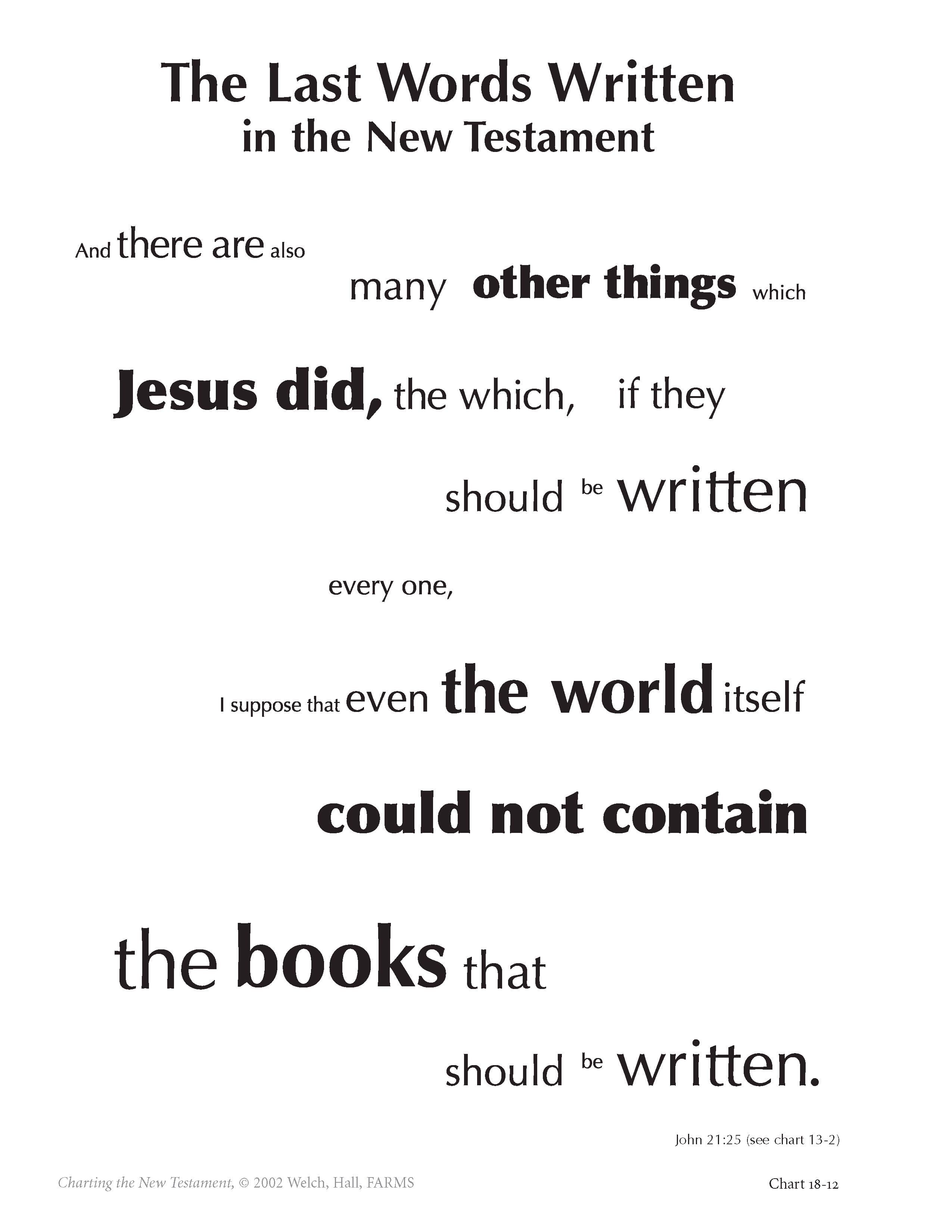 Probably the last New Testament book to be written was the Gospel of John, not the Revelation of John (which stands out of chronological order at the end of the New Testament collection today). John 21, the final appendix to the beloved apostle’s Gospel, ends with the firm attestation, “and we know that his testimony is true” (Jn 21:24) and with the sober reminder that Jesus did many other things not mentioned in the Bible—so many, in fact, that it would be impossible for all the books in the world to contain them.