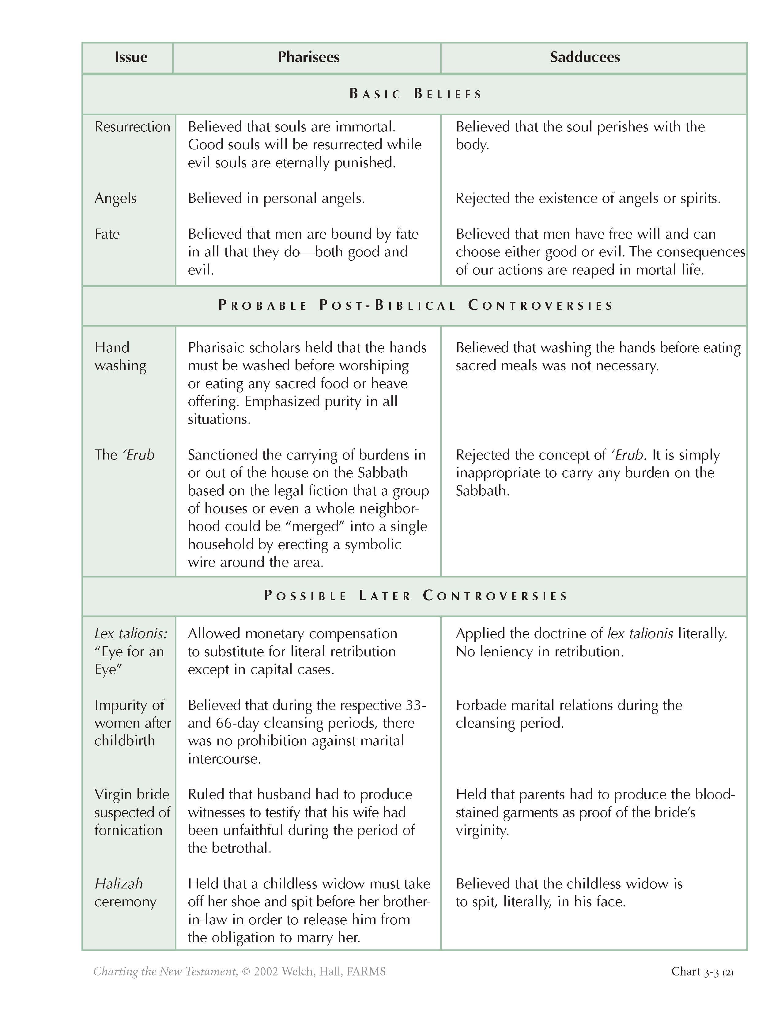 Chart 3-3 shows the most likely legal differences between the Pharisees and Sadducees during biblical times and perhaps later. These issues have been reconstructed out of later Jewish writings, especially the Talmud. One of the main differences between the Pharisees and the Sadducees was what they counted as “law.” Jesus was frequently asked questions about how the law should be understood, and from all appearances, this was a controversial topic of the day. The Pharisees included the oral law, or traditional rules that go beyond the legal materials found in the written Torah (the first five books of the Bible). Knowing something about the kinds of legal arguments that were controversial at the time of Jesus helps modern readers understand some of the questions that were asked of him and how his audiences may well have understood the contemporary significance of his answers and teachings.