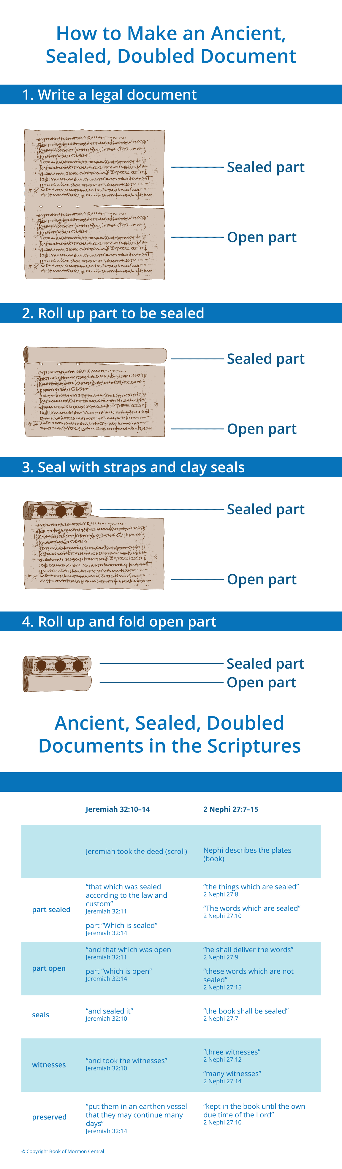 In formal Israelite legal documents, there were two parts, as documented by Jeremiah: one part that was sealed, and one part that was open (see Jeremiah 32:10–14). Seals were placed on the closed portion, and witnesses signed the end of the document, attesting to its authenticity. Finally, the sealed doubled documents were placed in containers and preserved. The Book of Mormon, as 2 Nephi 27:7–15 indicates, followed this ancient process of sealing and authenticating a text. The plates of Nephi had two parts: one open and one closed. Seals kept the closed part secure, and as promised anciently, witnesses were provided who signed the Book of Mormon after it was translated.