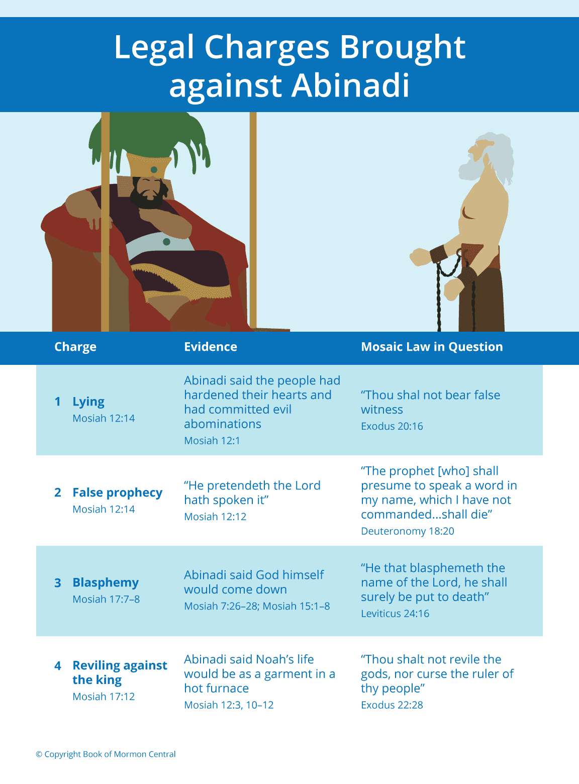 Though the charges proved unfounded, Abinadi was accused by Noah’s priests of violating Mosaic law. This chart lists (1) the four charges brought against Abinadi, (2) the false evidence that Noah’s priests used to accuse him, and (3) the Mosaic laws on which each accusation rested. The priests of Noah knew the law of Moses thoroughly enough to twist it and use it against Abinadi when he prophesied against Noah and of Jesus Christ. Although the first three charges all failed, they were at least nominally grounded in the law. Abinadi was finally put to death for having “reviled the king” (Mosiah 17:12), which is prohibited in Exodus 22:28. Ultimately, however, these tactics worked to the priests’ own undoing.