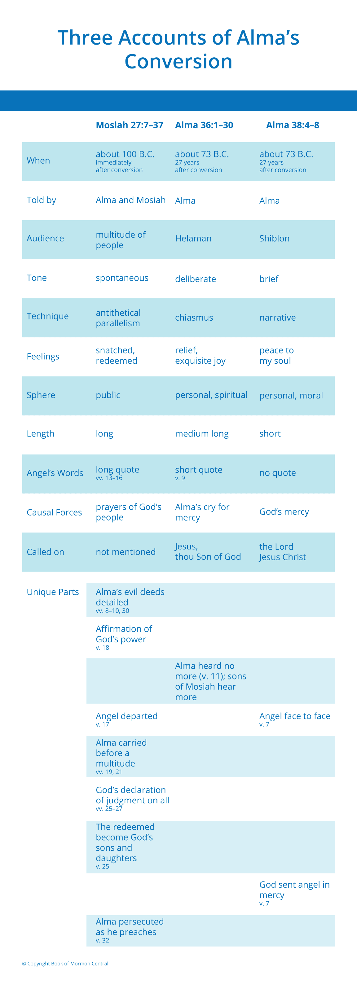 Alma’s conversion is documented in three places in the Book of Mormon. This chart compares the rhetorical situation of each of these accounts and shows how the context of the situation may have in part determined the way Alma expressed his conversion story each time he told it. Though each account differs from the others, all were appropriate for the contexts in which they were given.