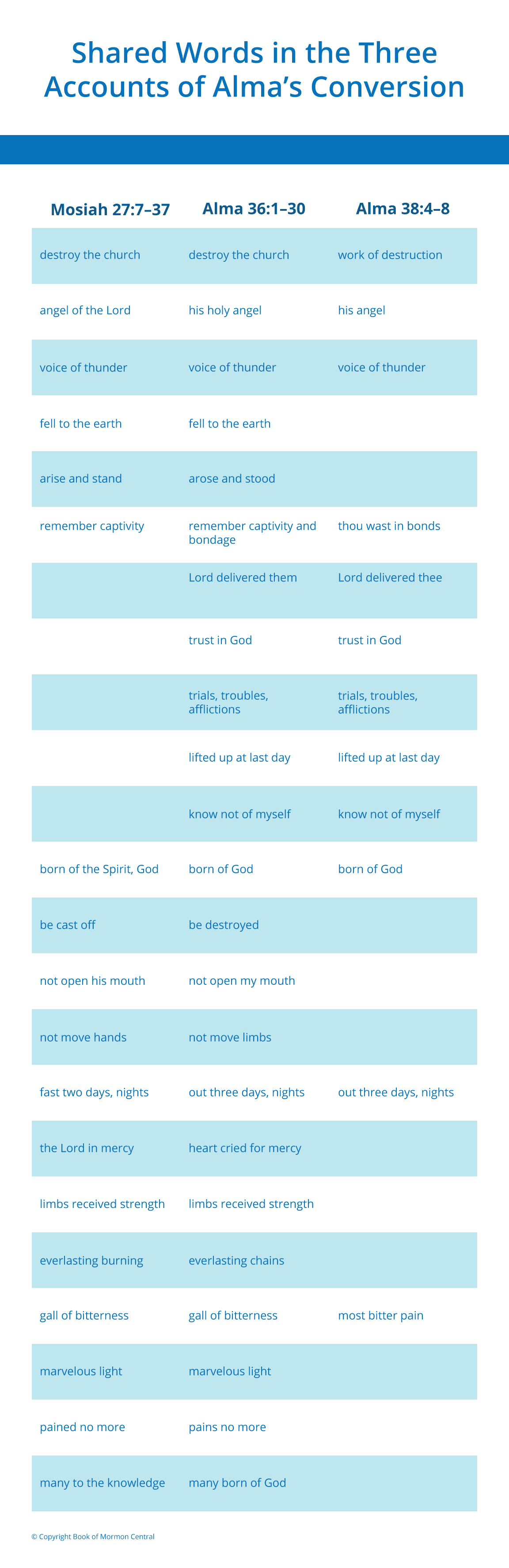 The three accounts of Alma’s conversion recorded in the Book of Mormon contain many shared or similar phrases, suggesting that Alma had repeated his story often and in a distinctive manner. The use of shared words in these three accounts is circumstantial evidence of the authenticity of the Book of Mormon, since, in spite of the different settings of these accounts and the textual layers of compilation, abridgment, and translation, Alma’s unique, underlying personal voice can still be heard and identified.