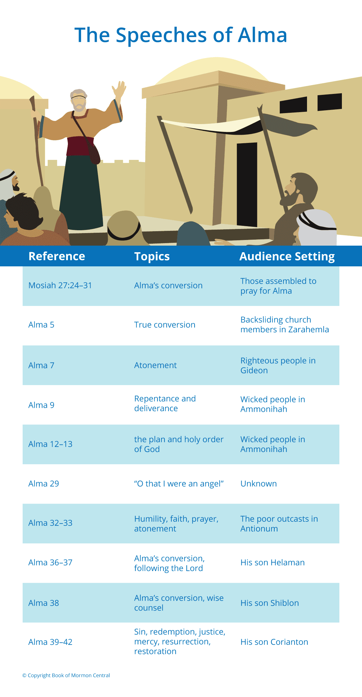Alma the Younger’s first recorded speech (see Mosiah 27:24–31) was the impromptu account of his conversion to the gospel of Jesus Christ. After his conversion, he devoted his life to preaching the gospel to as many people as would listen. These included the righteous, the wicked, the poor, the wealthy, and members of his own family. All of his known speeches or formal statements are cited in this chart, along with the topics and settings of those discourses.