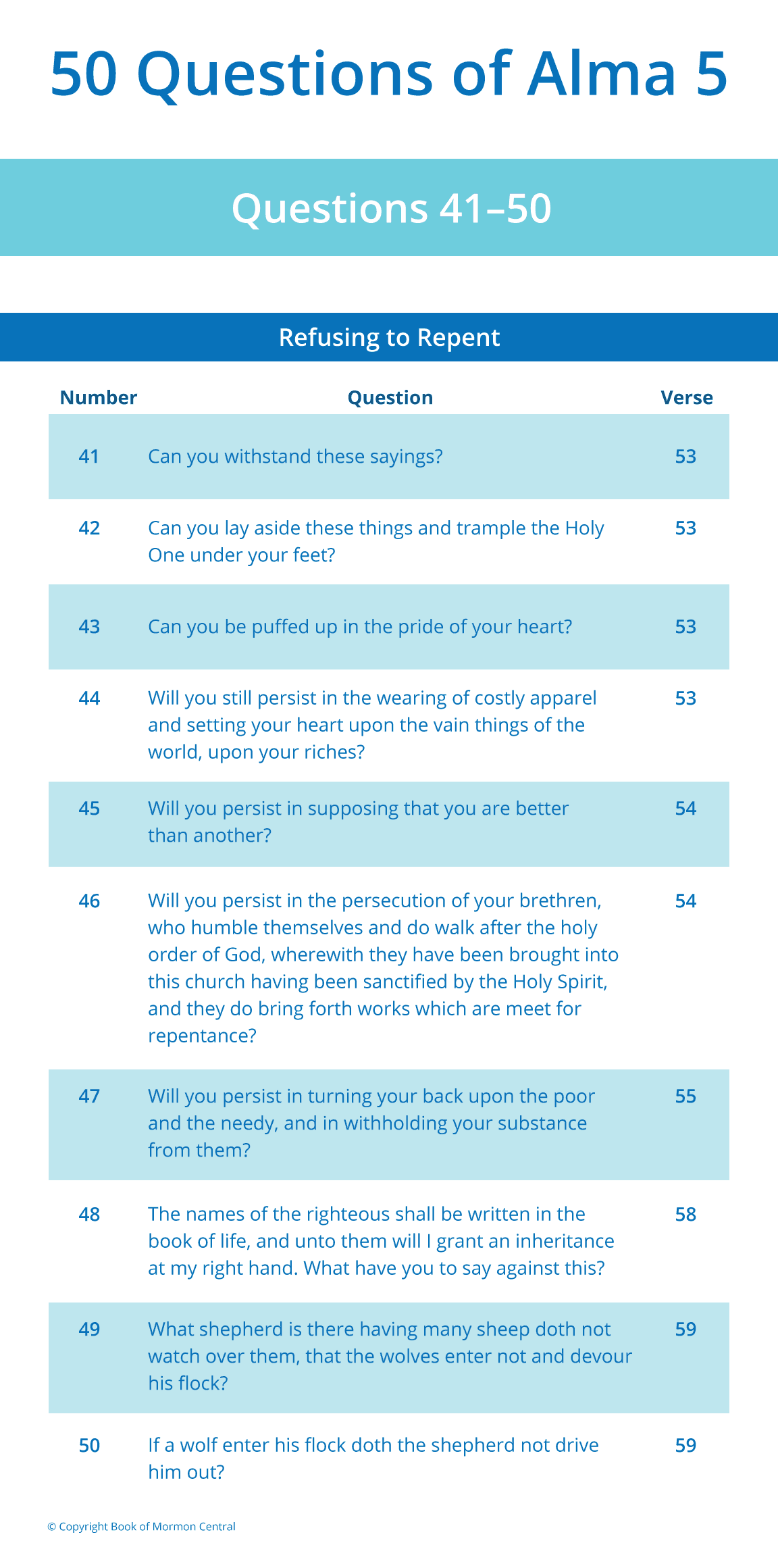 This chart lists rhetorical questions 41–50 directed to the people of Zarahemla. These last ten questions concern refusing to repent of sins. Alma’s phrase "trample the Holy One under your feet" (Alma 5:53) poignantly illustrates that individuals blatantly mock God when they know the source of salvation and yet refuse to repent and partake of that free gift. By ending his speech with these questions, Alma places the burden of repentance directly on the shoulders of each person who seeks to live a life pleasing to God.
