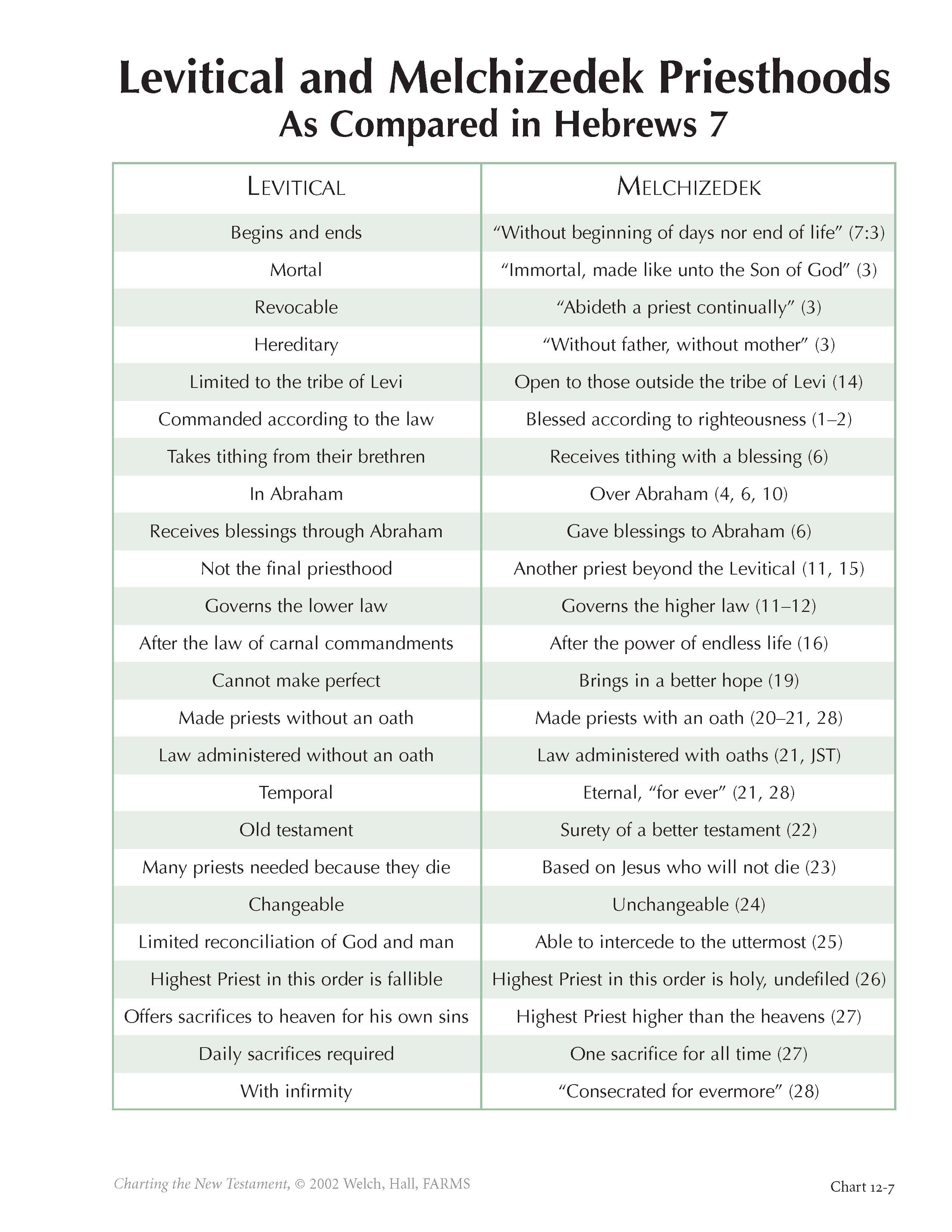 Hebrew 7 speaks of two orders of priests and priesthood: the Aaronic or Levitical Priesthood, and the Melchizedek Priesthood. The lower priesthood serves many useful functions, but it serves below the higher priesthood. Chart 12-5 details the points of comparison between these two priesthoods as articulated in the epistle to the Hebrews. With Jesus, the old was made new, the temporal became eternal, and the lower law was fulfilled with the higher law.