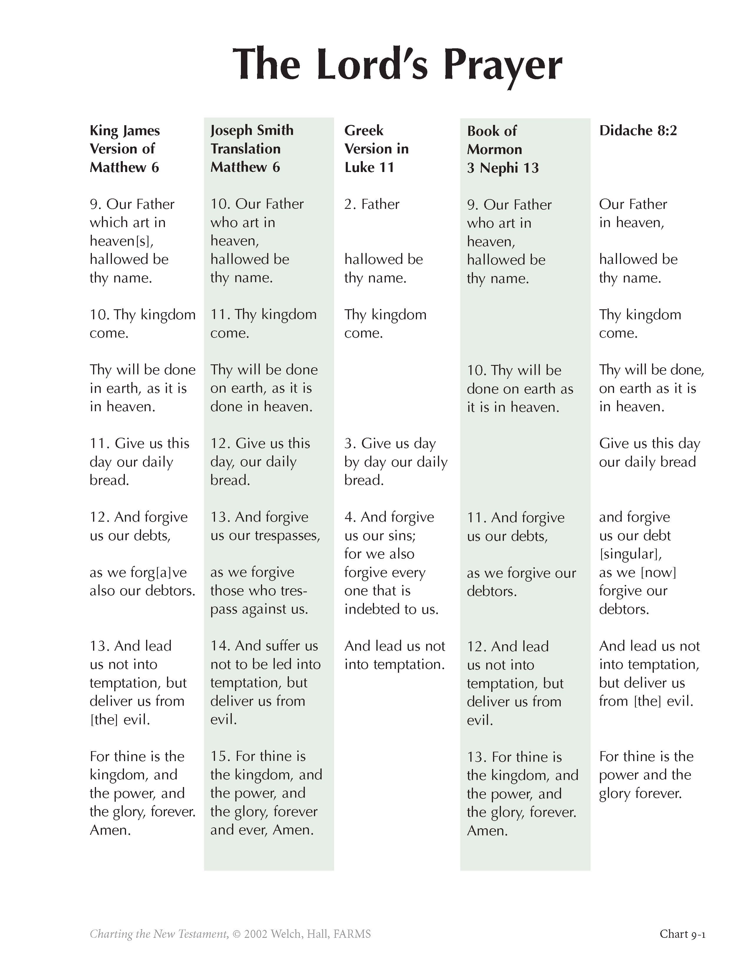 Chart 9-1 compares five versions of the Lord’s Prayer. Each one is slightly different. In addition to the four prayers found in the scriptures, the fifth comes from a very early Christian handbook of instructions known as the Didache. Because the early Christians understood that this prayer was not to be rigidly recited verbatim, the surviving variations are not unexpected.