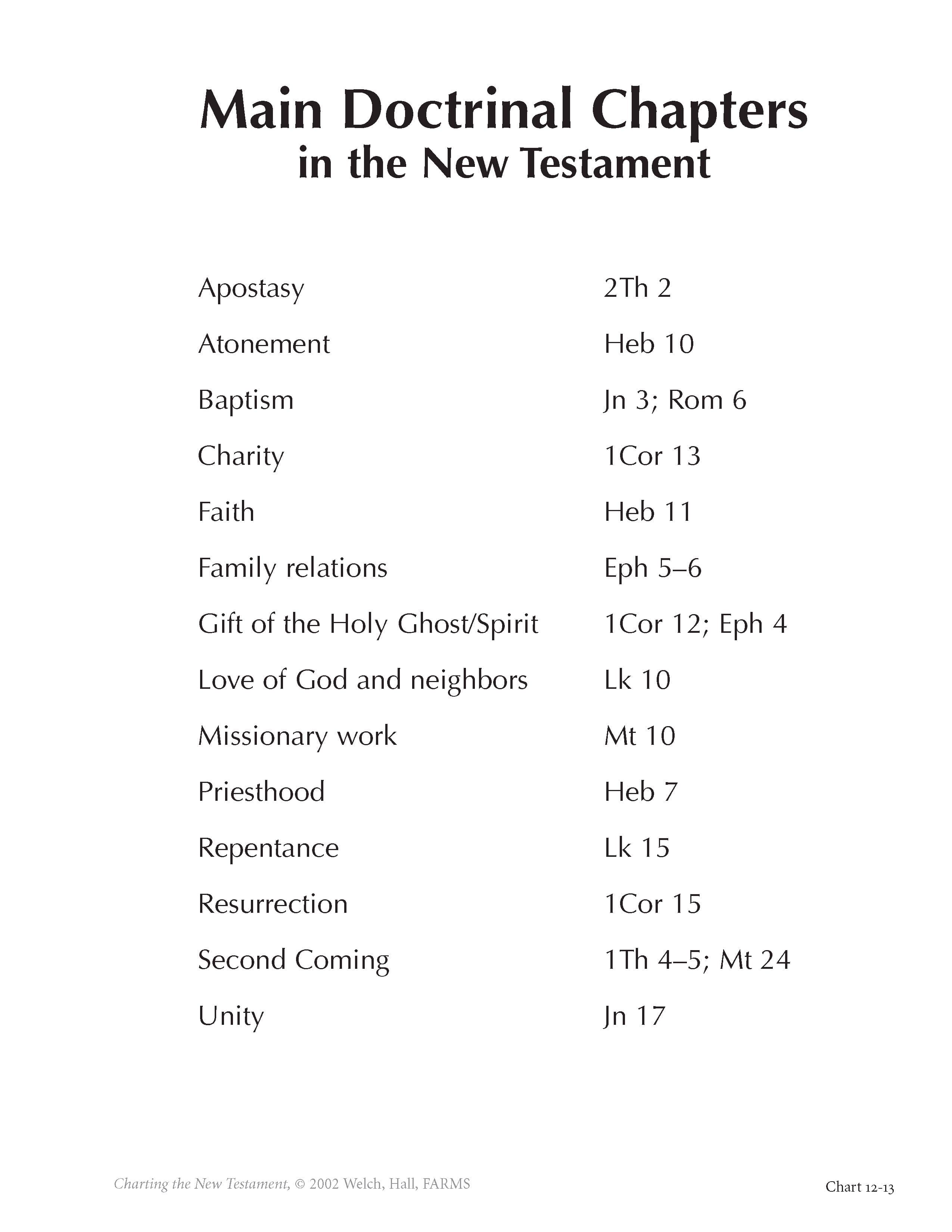 Certain chapters in the New Testament are especially famous. These doctrinal highlights express key concepts in unforgettably eloquent or powerful terms. To the list in chart 12-13 could be added many other topics and chapters, but those listed are certainly among the top favorites concerning the first principles and ordinances of the gospel (namely faith, repentance of the prodigal son, baptism, and the gift of the Holy Ghost), Christian living (charity, love of the good Samaritan, family relations, missionary work, priesthood, and unity), and the salvation history of the world (atonement, apostasy, second coming, and resurrection).