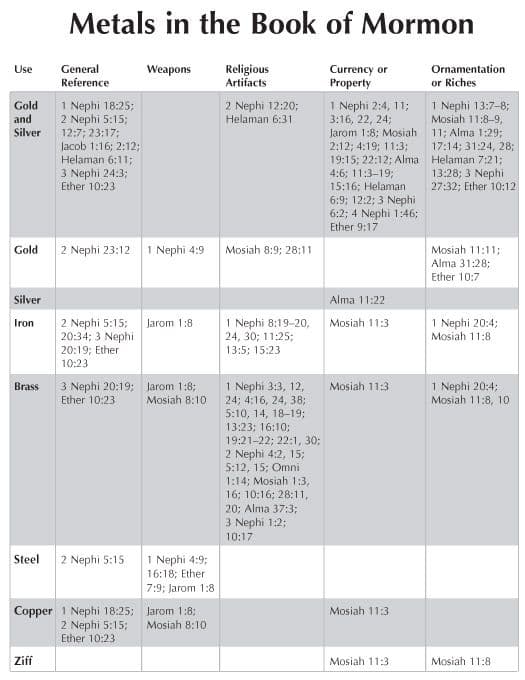Many Book of Mormon texts mention various metals. This chart lists the types of metal that the Nephites, Lamanites, and/or Jaredites knew from their scriptures or found in the Americas. These references are grouped according to the use of the metal in each case. Brass (especially in connection with the plates of brass) is mentioned most often in religious contexts, while gold and silver (often mentioned together) were used largely in commerce or for ornamentation.