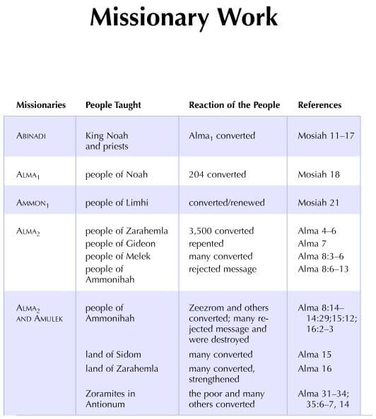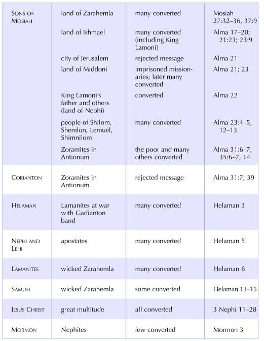 The importance of missionary work is a prominent theme in the Book of Mormon. This chart lists and compares the work of many of the ancient American missionaries, the people they preached to, the degree of success they had, and the scriptural references pertaining to their missionary labors. Reactions to the gospel message varied, despite the quality of missionaries in the field.