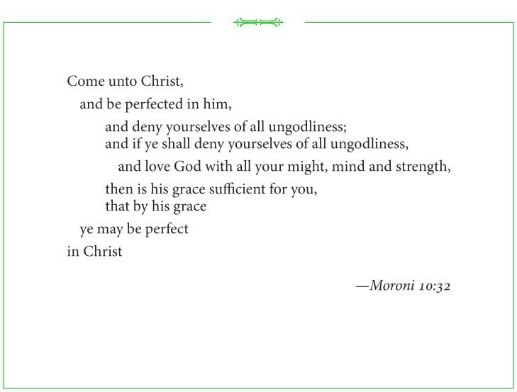Moroni concluded his record by addressing "all the ends of the earth" (see Moroni 10:24–34). He invited all to come unto Christ, to lay hold upon every good gift, to avoid all ungodliness, and to love God. Thus, through the grace of God, all may become "perfected," or complete, in Christ. The structure of this passage shows that becoming perfected in Christ calls for a double emphasis on shunning evil, together with a double measure of the grace of God.