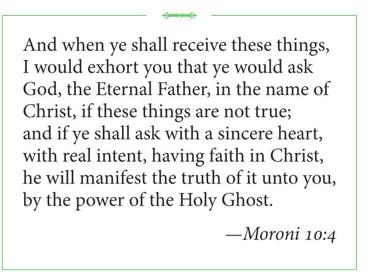 Moroni was the last to write on the plates of Mormon. He sealed the record with his testimony and called upon God as his primary witness of the truth of the records he was sealing up. He exhorted his brethren, the Lamanites (see Moroni 10:1–23). He admonished readers to ponder the words of the Book of Mormon in their hearts (see Moroni 10:3) and then to ask God with real intent, having faith in Christ, "if these things are not true." He testified that God will manifest the truth of the Book of Mormon by the power of the Holy Ghost and that "by the power of the Holy Ghost ye may know the truth of all things" (see Moroni 10:4–5).