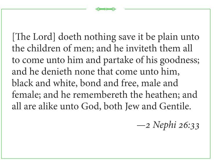The Book of Mormon is a very inviting book. Charts 171-75 present only a few of the verses in the Book of Mormon that invite all people everywhere to come unto Christ (see 2 Nephi 26:33), to believe in him and his words (see 2 Nephi 33:10), to forsake sin and be forgiven by the Lord Omnipotent (see Mosiah 4:10), to become sanctified and spotless before God (see 3 Nephi 27:20), to do good and to love God and serve him (see Moroni 7:13), to ask God for a witness of the truthfulness of the Book of Mormon (see Moroni 10:4), and to become perfected in him (see Moroni 10:32). These heartfelt invitations, universally extended by Nephi, Benjamin, Mormon, Moroni, and Jesus Christ himself, consistently greet all people with open arms, inviting them to come and partake of the fulness of God's joy. Through invitations such as these, readers everywhere feel included in God's saving love. They accept these invitations in faith by forsaking their sins, being baptized, and going forth to do good under the Lord's inspired direction.
