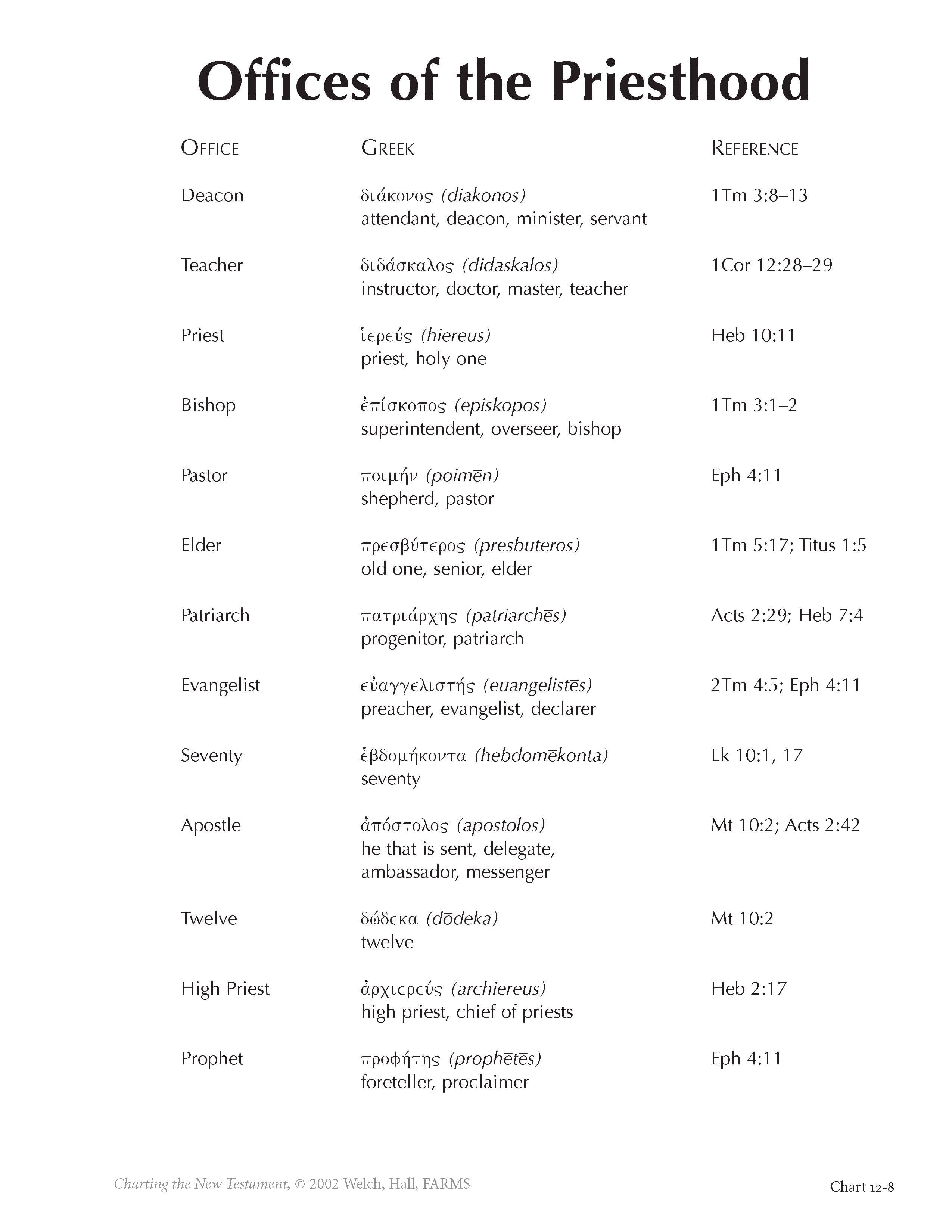 An important doctrinal tenet of the restored Church of Jesus Christ concerns the organization of the priesthood which it shares with its counterpart in the meridian of time. Chart 12-8 demonstrates this correlation. It lists priesthood offices or church functionaries, giving modern names and New Testament counterparts, which are noted under their Greek names along with brief translations. A scriptural reference where the Greek term occurs in the New Testament is also provided. Each of these offices and functions was crucial in the establishment and nurturing of Christian congregations, communities, and churches from the earliest decades of the New Testament era, as they are in similar although not identical ways today.