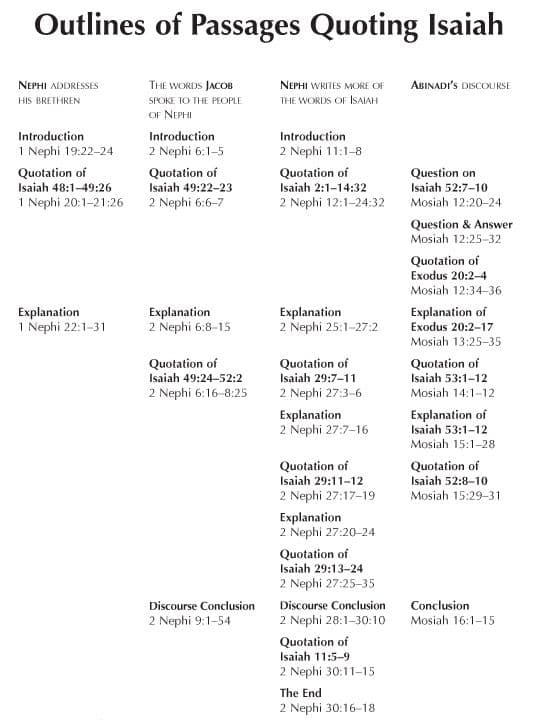 When Nephite prophets quoted Isaiah, they used a quoting formula of sorts, usually consisting of an introduction, a quotation, an explanation of the quotation, and a conclusion. This chart outlines the structures of four major scriptural passages in which Book of Mormon prophets quote Isaiah at length. Though each passage varies slightly from the four-part quoting formula, the pattern is definite, helping readers to follow the thoughts of Isaiah and to make good use of the explanations provided by Nephi, Jacob, and Abinadi.
