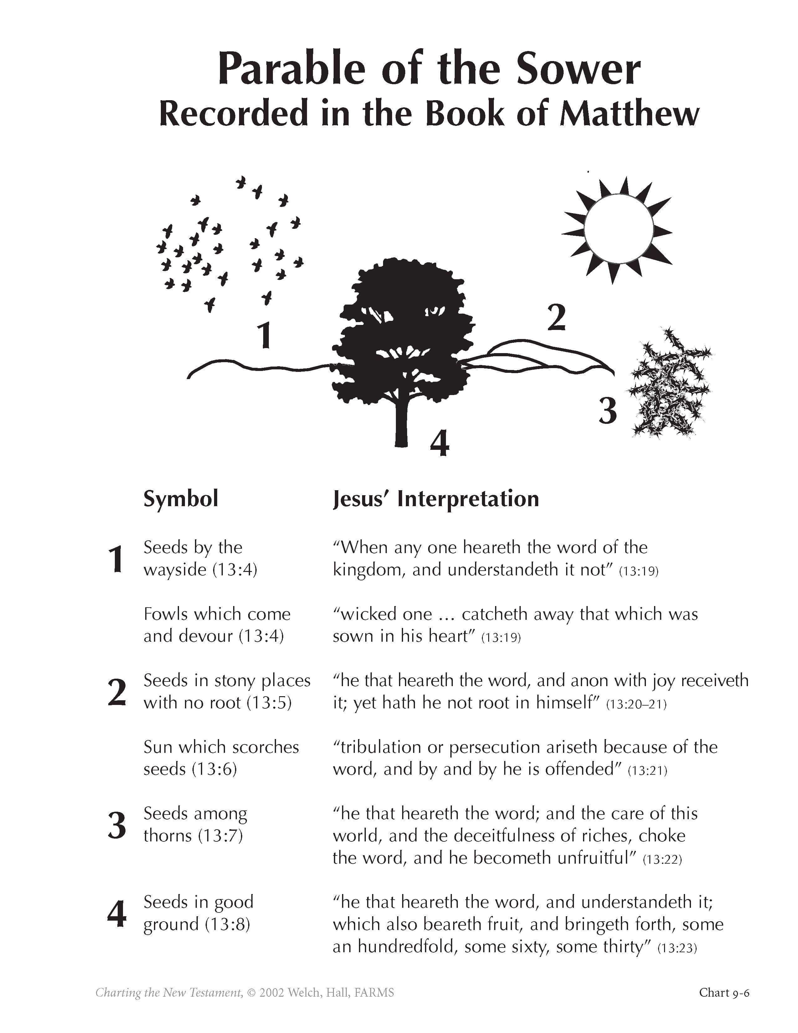 Jesus was a masterful teacher who often used parables to convey different levels of meaning to audiences with different levels of faith or understanding. See chart 7-7 for a full list of the parables. On two occasions reported in the Gospel of Matthew, Jesus took his disciples aside and told them the deeper meaning of his parables, for those who had eyes to see and ears to hear. Chart 9-6 illustrates the explanation he gave of the parable of the sower, and chart 9-7 shows the meaning of the parable of the wheat and the tares, both found in Matthew 13. The Prophet Joseph Smith affirmed that Jesus actually explained the symbolic meaning behind each of his parables: “The parables were all plainly elucidated” by Jesus to his disciples. Chart 9-8 displays the explanations given by Joseph Smith of the meanings behind the other parables in Matthew 13.