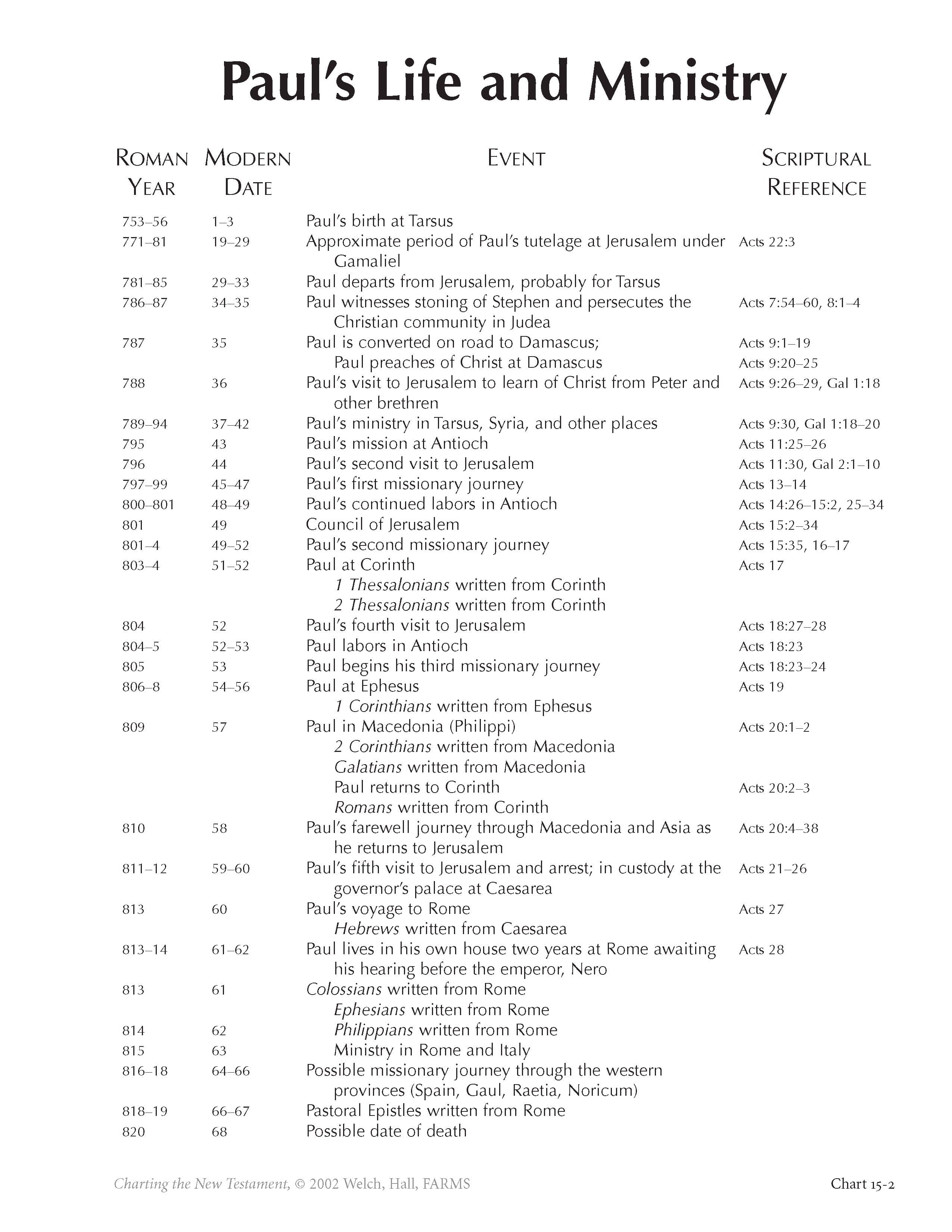 The book of Acts provides an excellent outline of many parts of Paul’s ministry. Although exact dating can be ventured for only some of the events in Paul’s life, a fairly reliable sequence of events and even the approximate dating of those events is found in chart 15-2. As far as possible, the time and place of Paul’s composition of individual epistles are included. Dating is given in the Roman system used at the time, with modern equivalents. Also offered are scriptural references for the activities noted in the scriptures. Aspects of Paul’s ministry after his arrival at Rome are conjectural, based on early Christian tradition.