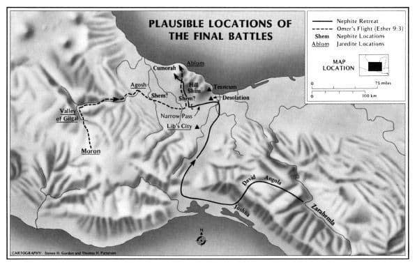 Though evidence from the Book of Mormon is not conclusive, final battles of the Nephites and the Jaredites probably took place not far north of the narrow neck of land. As shown, the Nephites marched from Angola, through David, and eventually came to the city of Joshua (see Mormon 2:4–6). Nephite defense lines lay in Joshua for fourteen years; finally they collapsed, and Nephites retreated across the narrow neck of land, fleeing to various sites (see Mormon 2:16). The hill Ramah/Cumorah, upon which both the Jaredites and Nephites fought their last battles (see Ether 15:11; Mormon 6:4–6), is shown here on the northwestern edge of the Tuxtla Mountains in Mexico, about ninety miles from a narrow pass (see Mormon 3:5). Other Jaredite locations, including Omer's flight to Ramah (see Ether 9:3), are also shown here. Again, these locations are plausible, but not definite.