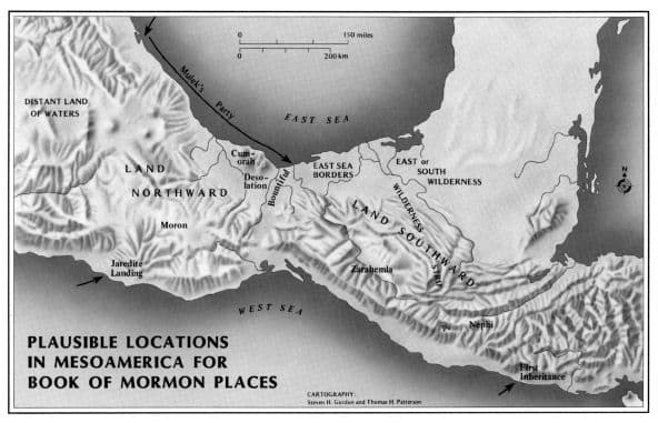 Many accounts of significant lands and cities are given in the Book of Mormon. The main passage mentions the land of Nephi bordering on the seas, "a narrow strip of wilderness," the land of Zarahemla, and the headwaters of the river Sidon (see Alma 22:27). The land of first inheritance to the west (see Alma 22:28), the land Bountiful to the north, and the land Desolation farther north (see Alma 22:29) are also mentioned. The "land northward" and the "land southward" were divided from each other by a narrow neck of land, whose width was "a day and a half 's journey for a Nephite" (see Alma 22:32). Mulek's party first arrived in the land north (see Helaman 6:10) and then moved south into the land of Zarahemla (see Omni 1:16). This map plausibly positions these and other Book of Mormon locations in the general Mesoamerican arena.