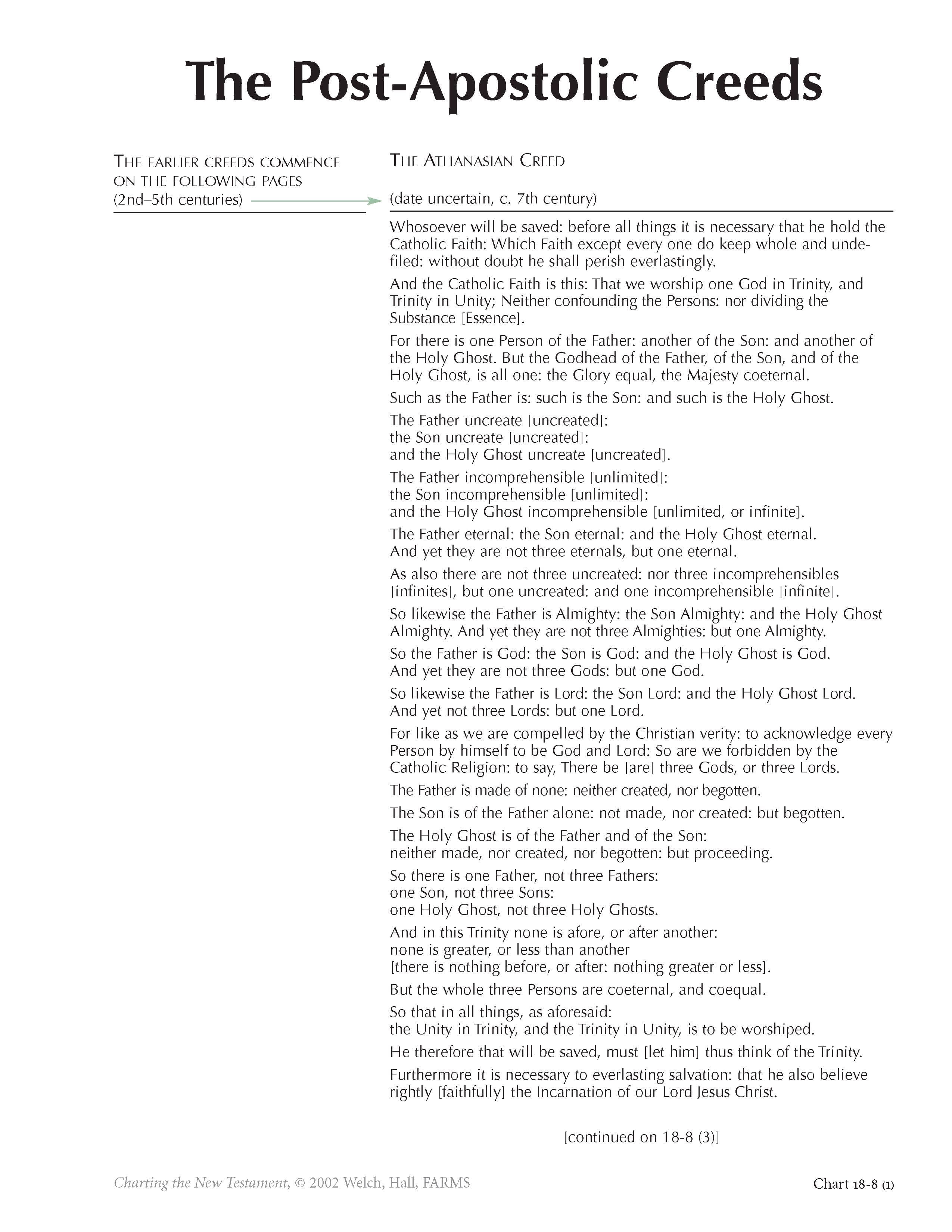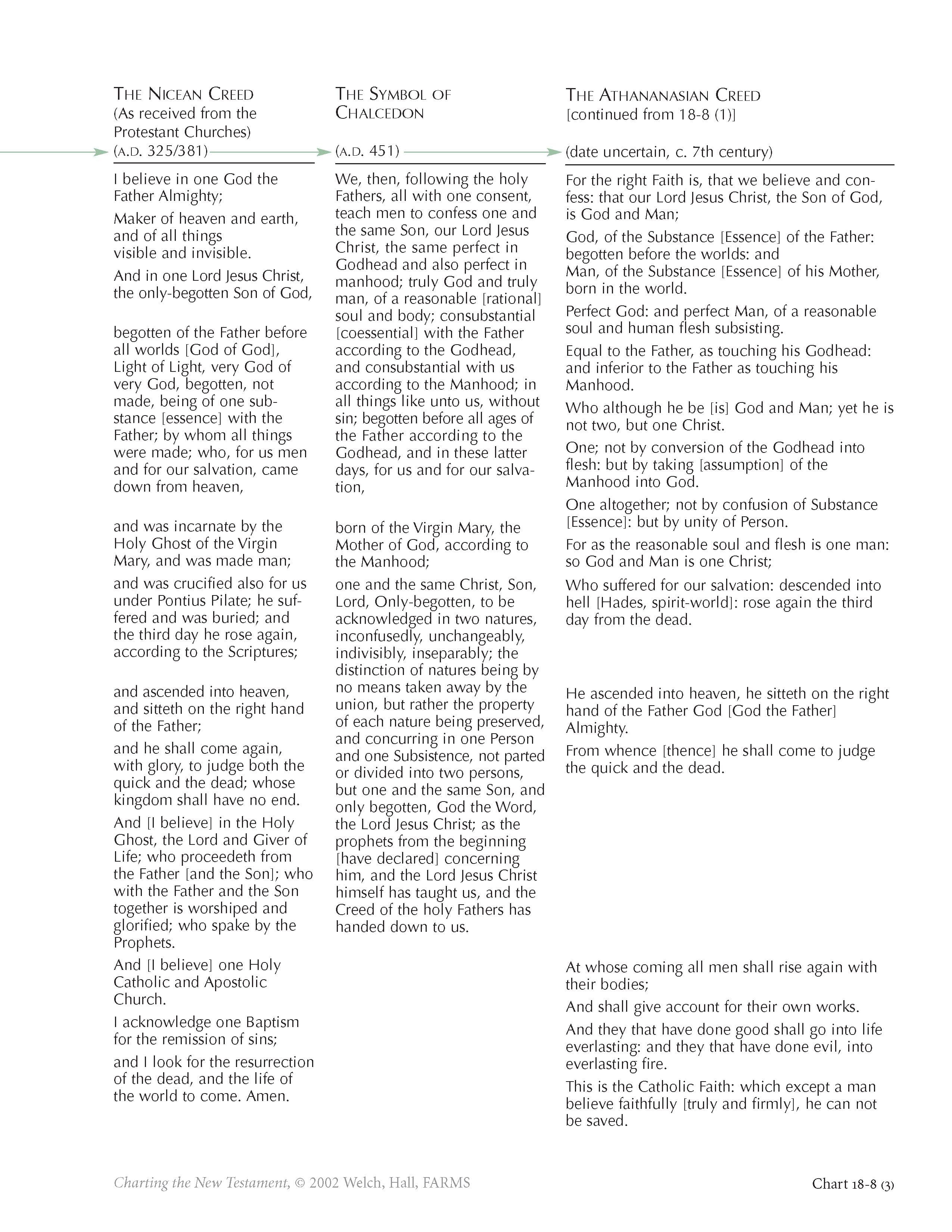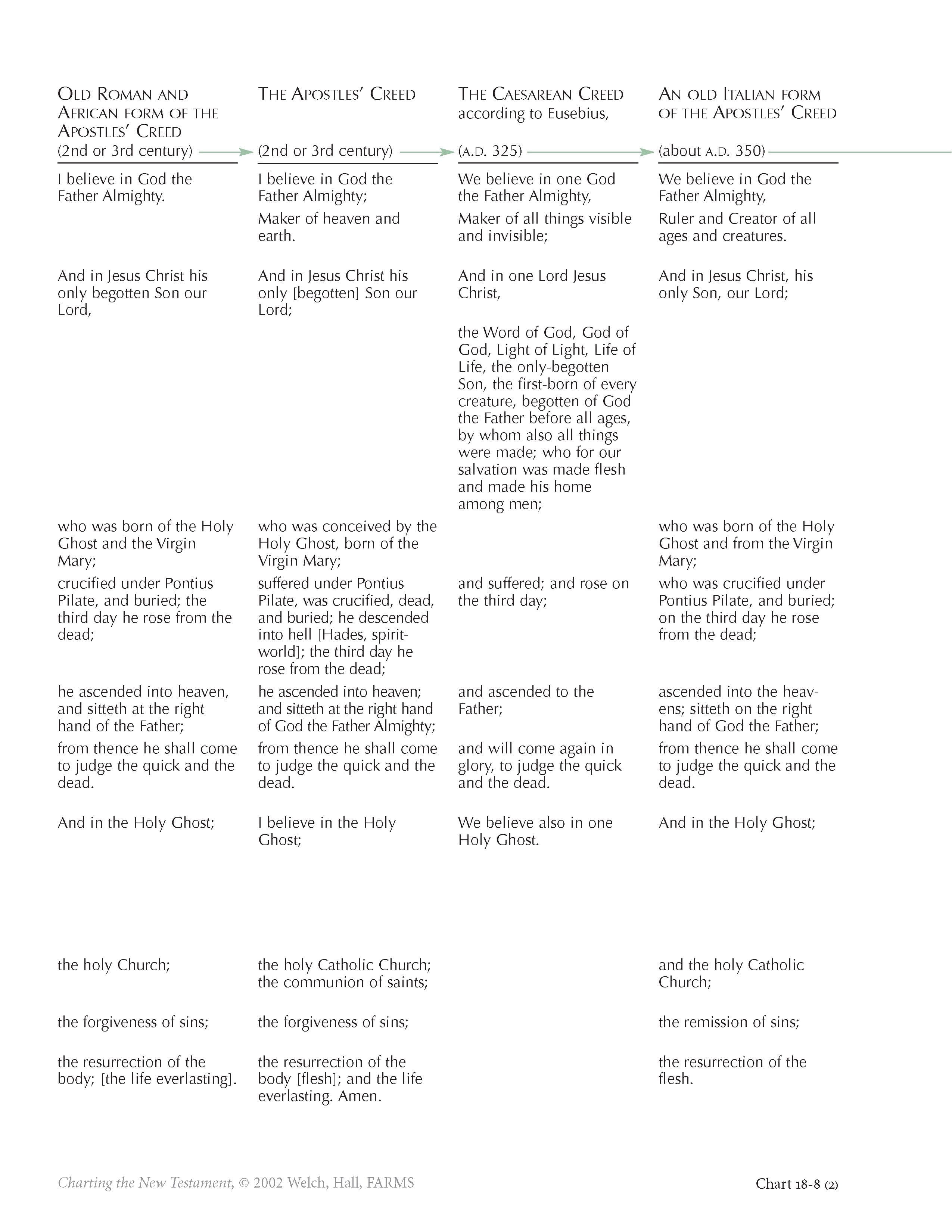 Beginning around the third century, Christians began to espouse and require of each other adherence to particular creeds demonstrating and propagating their belief in Jesus Christ. Such creeds were needed because many people were teaching a wide range of doctrines about Jesus. Some of these heretical groups, indeed, were way off the center mark. The creedal cure, however, went too far in the opposite direction, taking the liberty of the pure and simple spirit that had prevailed in the apostolic era (see chart 18-7) and prescribing extensive definitions and boundaries on the faithful. As chart 18-8 shows, this difficulty became increasingly severe.What began as fairly straightforward, biblically based declarations in the Old Roman, Apostles’, and Caesarean Creeds, became more and more arcane, philosophical, and delimiting as the fourth and fifth centuries played themselves out. This process of accretion, adding phrase on phrase, from creed to creed, is traced on chart 18-8. Most problematic, ornate, and obscure, the so-called Athanasian Creed is of unknown authorship, was never adopted by a church council, and probably dates to the seventh or eighth century.