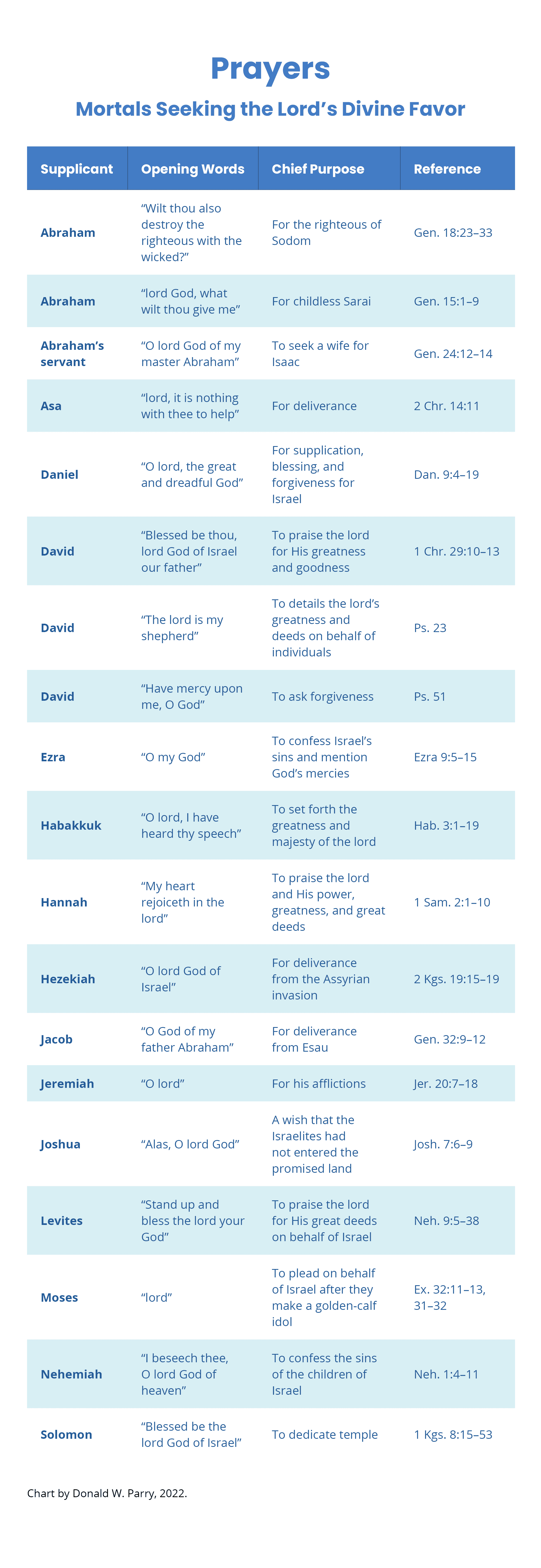 The chart sets forth several prayers from the Old Testament; the columns indicate the name of the supplicant (column 1, listed alphabetically), the opening words of the prayer (column 2), the prayer’s chief purpose (column 3), and the scriptural reference (column 4).