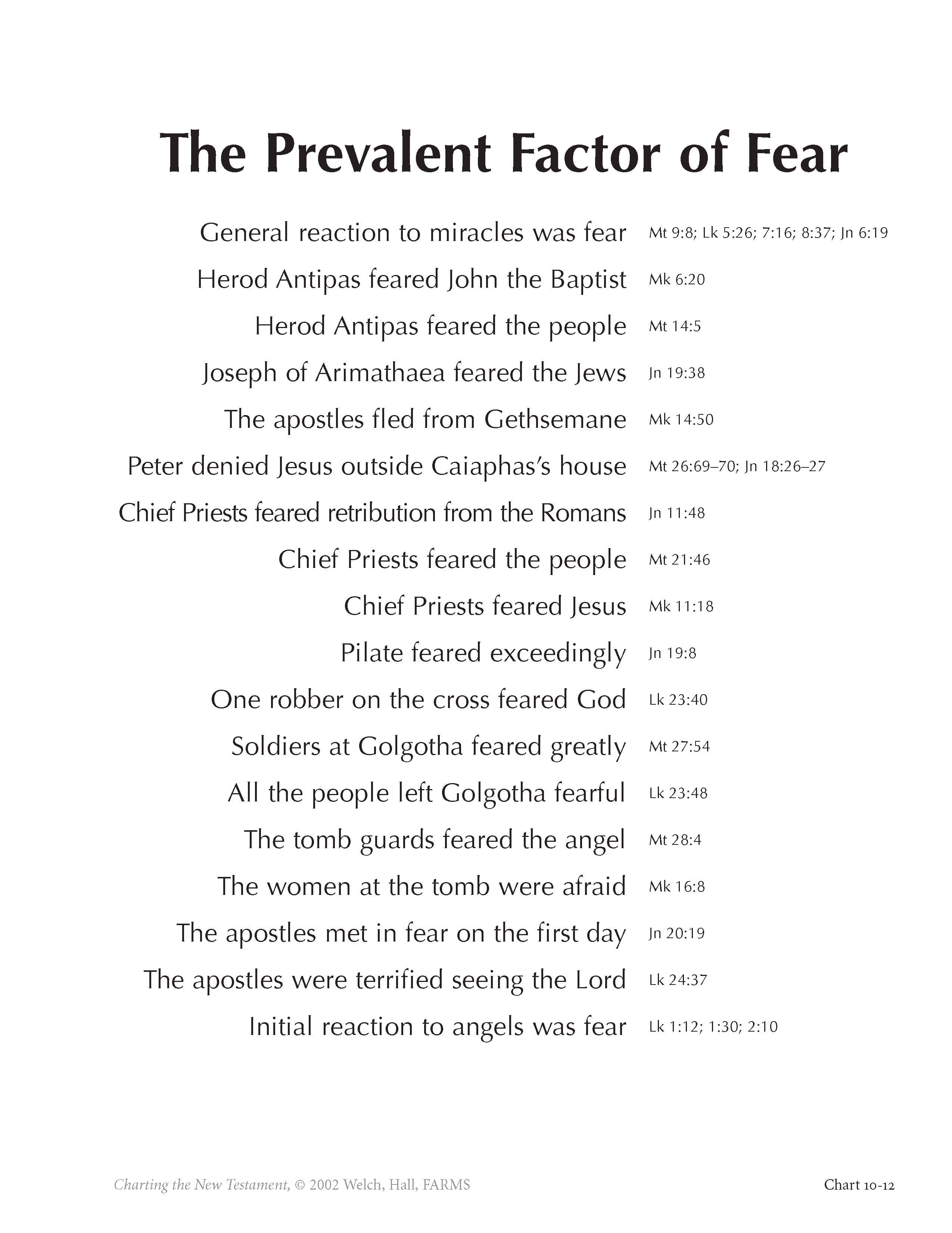 Although the factor of fear is rarely mentioned by New Testament commentators, fear may well provide the consistent driving undercurrent that best explains all the irregularities and vagaries of the so-called trials of Jesus. Powerful and pervasive, this consistent factor runs through the story as an underlying emotion (even though all people were not afraid of the same thing). Consequently, the legal proceedings before the Jewish council and Pontius Pilate should not be viewed as wholly rational affairs. As chart 10-12 shows, many people arrayed around Jesus were afraid of one thing or another. Most often, they were deeply afraid of the supernatural. Jesus’ healings and control of physical elements were open and impressive. They must have been the cause of profound concern to anyone who took these miracles seriously and did not believe that he was the Son of God. The only other option was to reject him as an evil wonder-worker or deceiving magician.